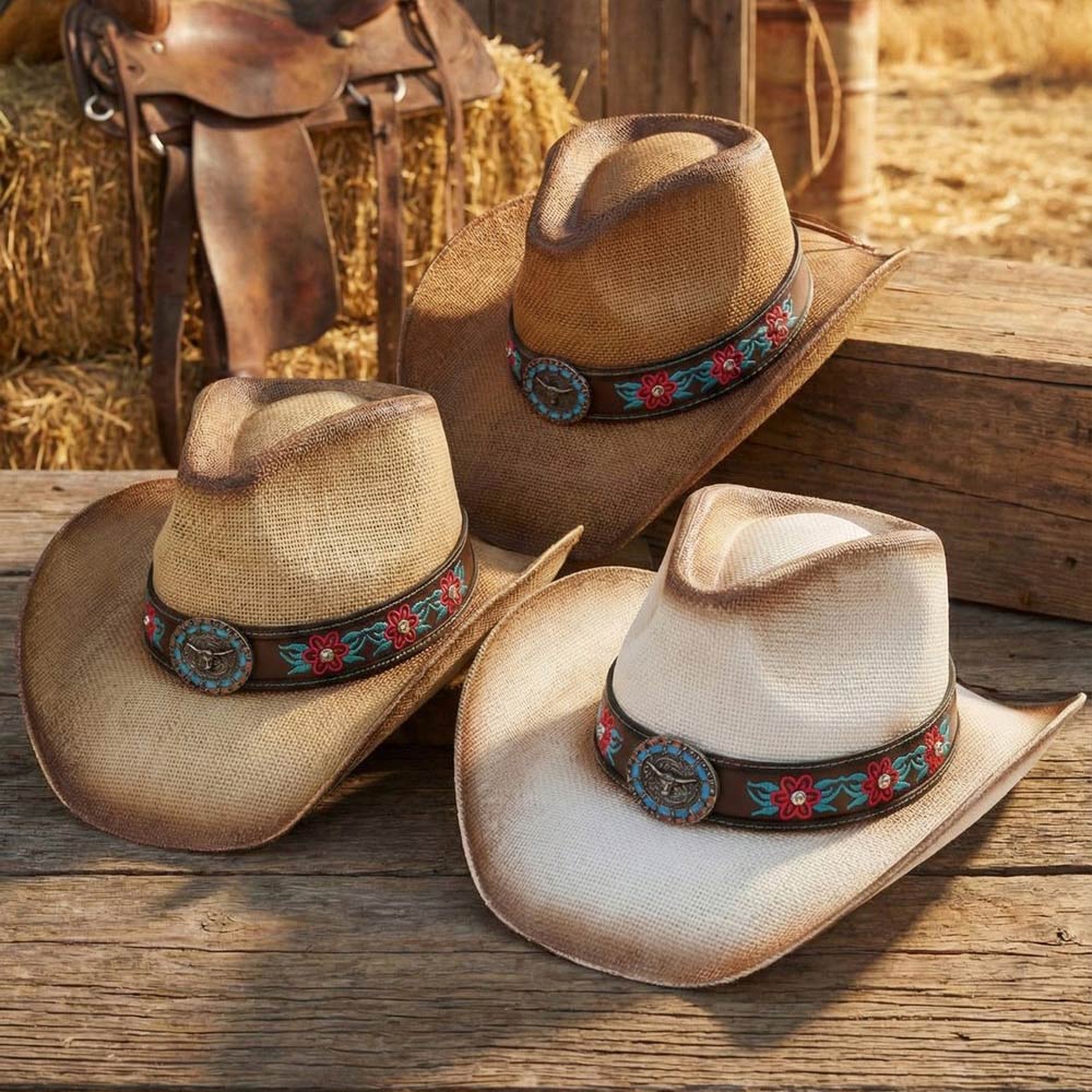 Details • Size : One Size • Material : 100% Paper • Stylish western cowboy hat featuring an embroidered floral accent band and decorative concho detail for a bold statement finish. Designed with a structured crown and curved brim, this hat is ideal for festivals, rodeos, concerts, country events, and everyday western-inspired outfits.