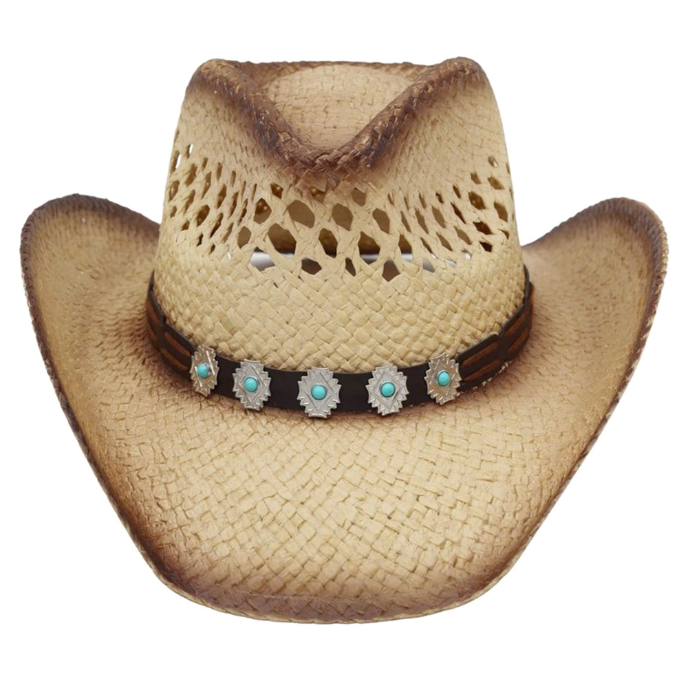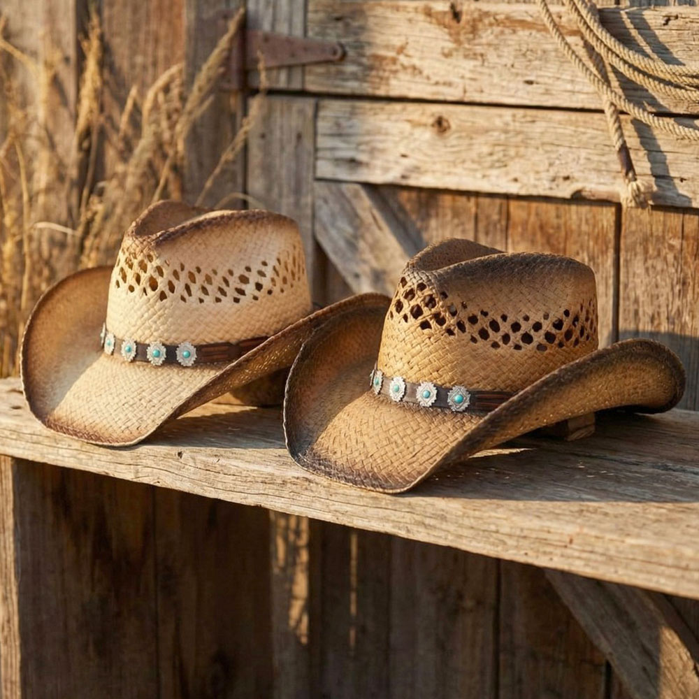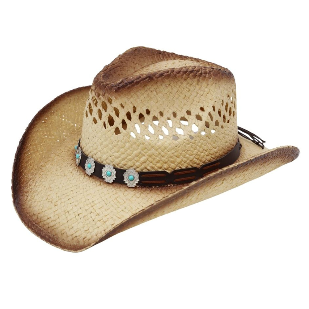 Details • Size : One Size • Material : 100% Paper • This western cowboy hat features a ventilated crown and structured curved brim, highlighted by a decorative concho-accent band for authentic western character. Ideal for country outfits, rodeo looks, festivals, western-themed events, and boutique displays, it delivers bold style with classic cowboy appeal.