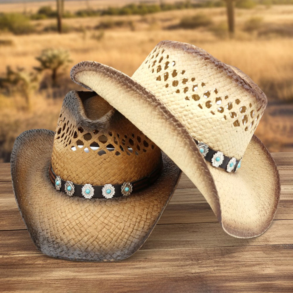 Turquoise Stone Faux Leather Band Aged Look Two Tone Western Woven Cowboy Hat