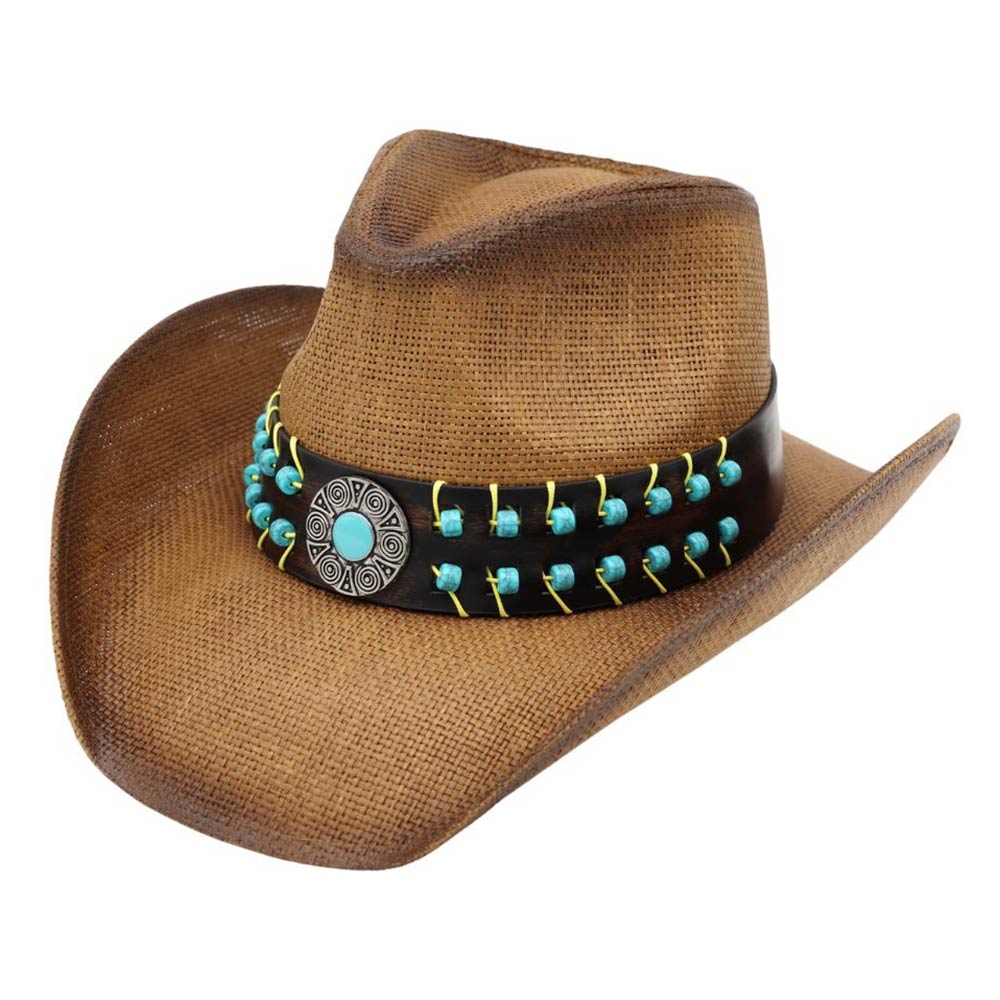 Details • Size : One Size • Material : 100% Paper • Eye-catching western cowboy hat featuring a beaded concho accent band that adds bold character and charm. Designed with a structured crown and curved brim, this statement hat is perfect for festivals, rodeos, concerts, country events, themed outfits, and standout everyday western looks.
