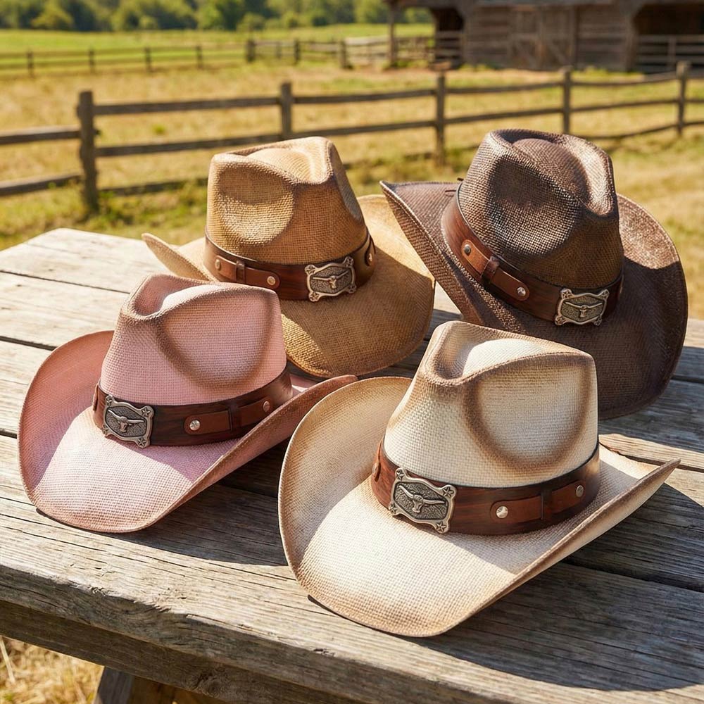 Details • Size : One Size • Material : 100% Paper • Classic western cowboy hat designed with a bold longhorn buckle accent band for a rugged, iconic look. Features a structured crown and curved brim that elevate rodeo outfits, country concerts, festivals, western-themed events, and everyday statement styling with timeless cowboy appeal.
