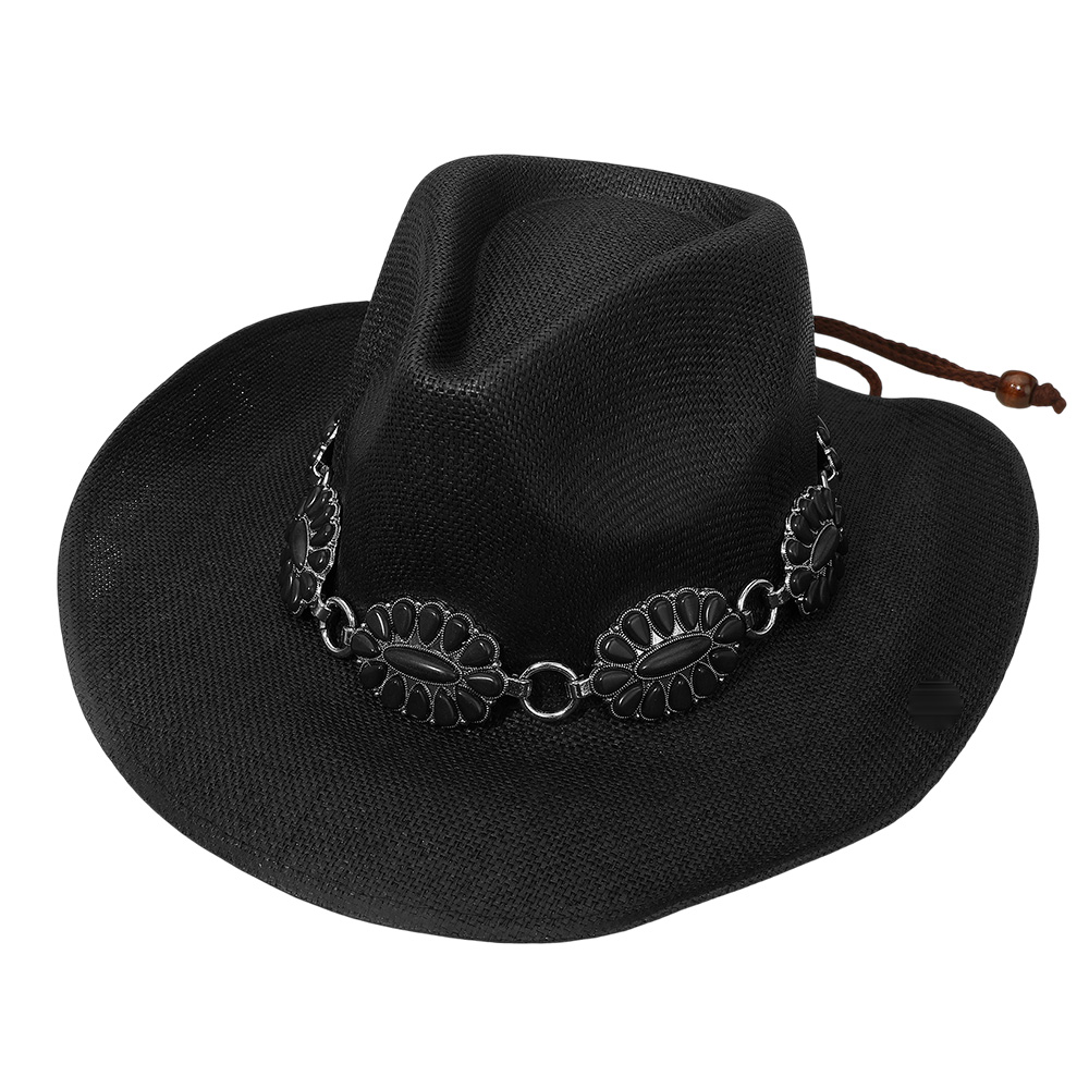 • Showcase bold western style with this cowboy hat featuring a linked concho band in a striking design. Perfect for festivals, concerts, or casual wear, it blends rugged tradition with sleek detail, making it a standout accessory for any modern cowboy look.