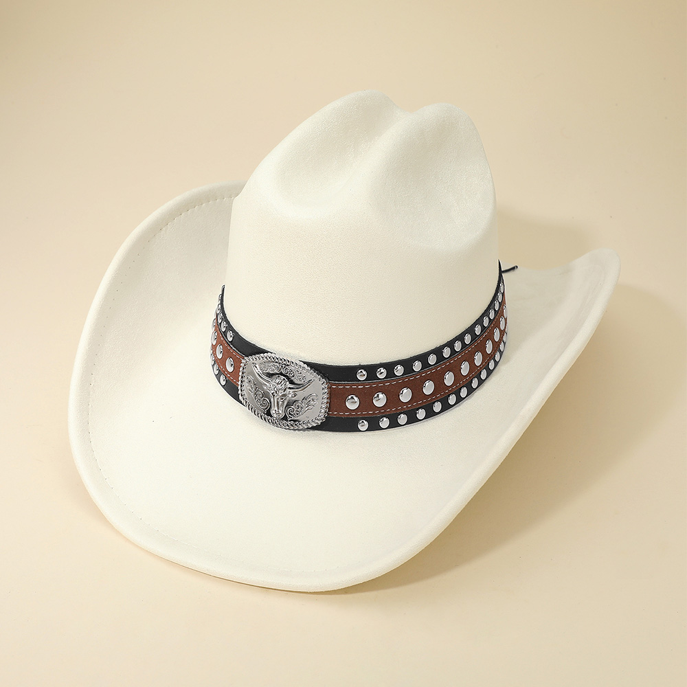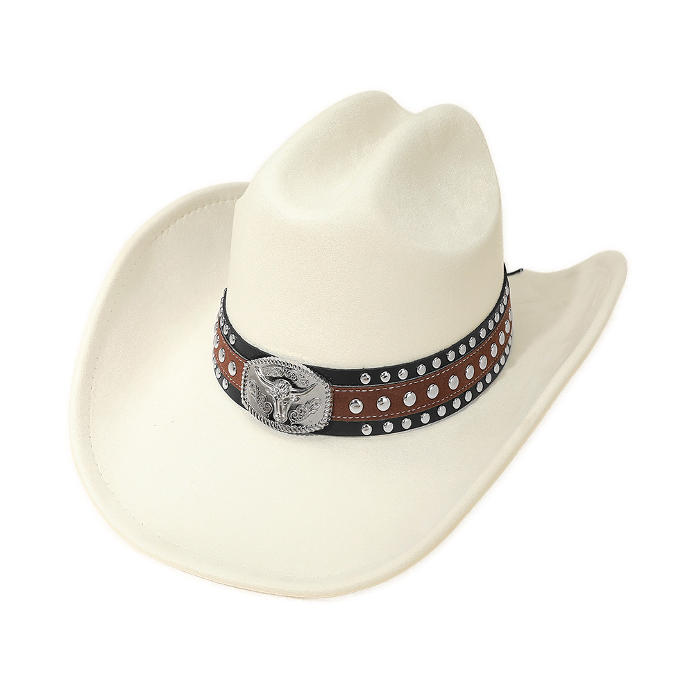 • Western cowboy hat accented with a bold steer head buckle band, featuring studded details for a rugged finish. Perfect for rodeos, concerts, festivals, and everyday wear, this hat combines durability with authentic cowboy style, making it a standout piece in western fashion collections.