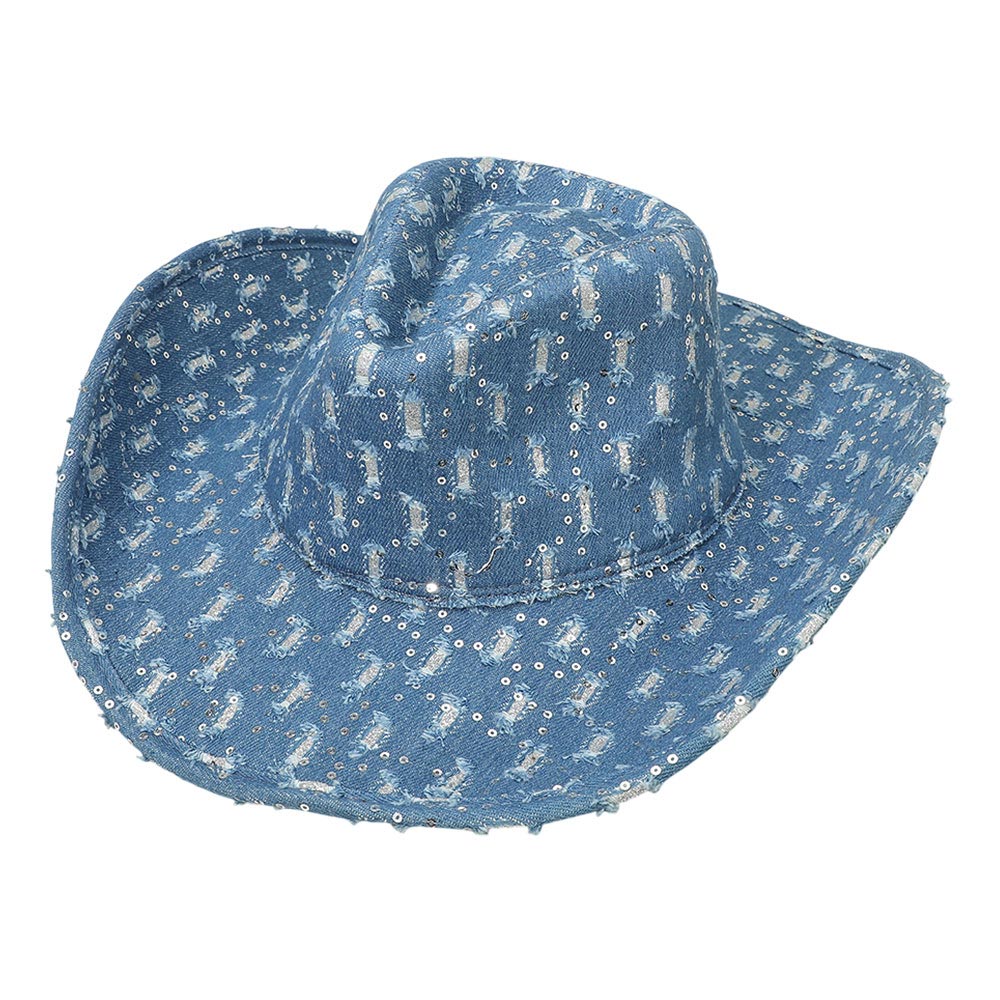 Details • Crown Circumference : 23" • Crown Height : 4.5" • Brim Height : 3.75" • Material : 100% Cotton • Statement cowboy style hat featuring an allover sequin pattern with a structured crown and wide brim silhouette. Designed to elevate festival outfits, themed events, concerts, and costume styling, this eye catching accessory adds bold texture, visual impact, and standout appeal to any fashion or novelty collection