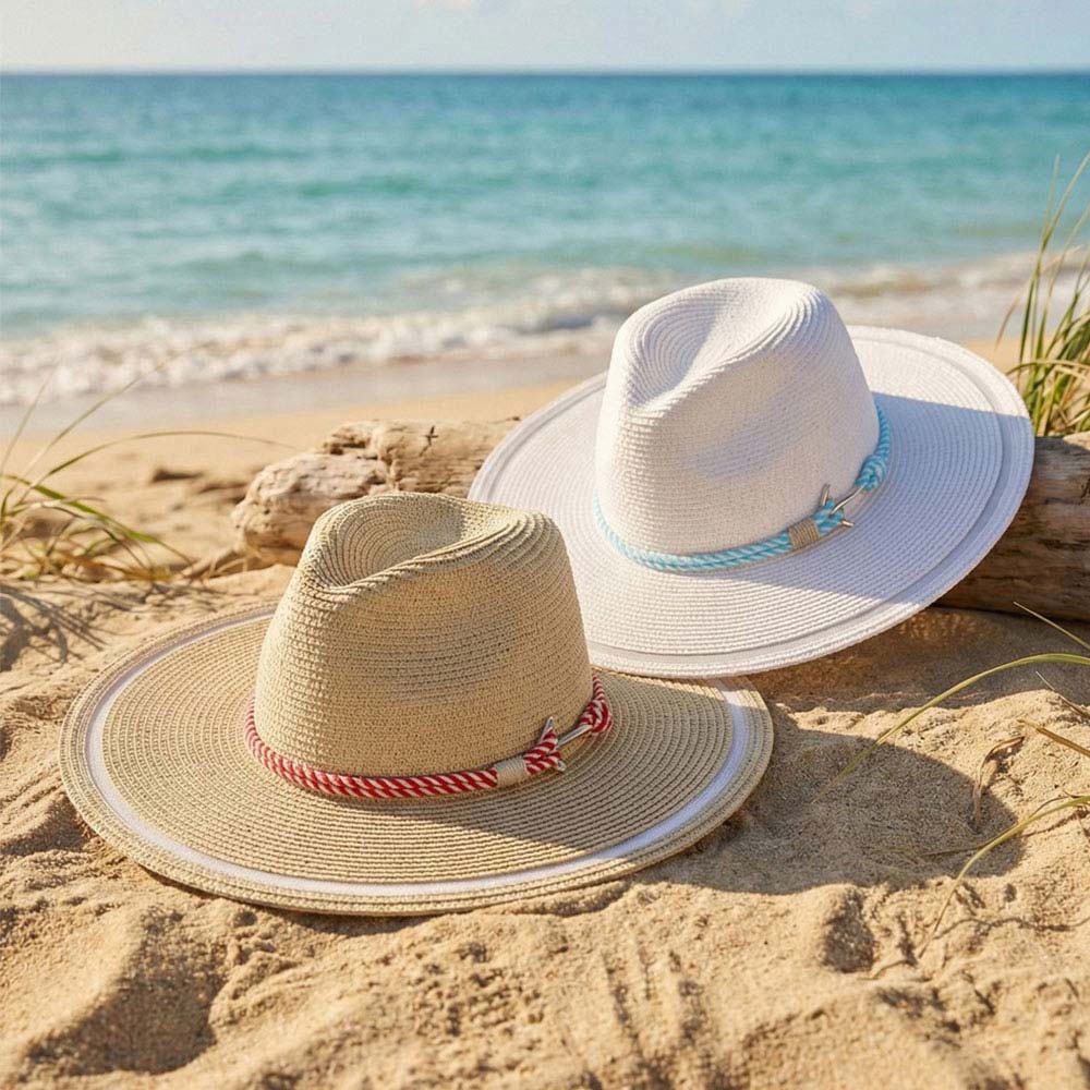 • This wide brim sun hat features a structured crown and a decorative rope band accent for a clean, modern look. Ideal for boutiques, summer displays, vacations, outdoor events, festivals, and everyday styling, it offers a versatile silhouette that pairs easily with casual and resort-inspired outfits.