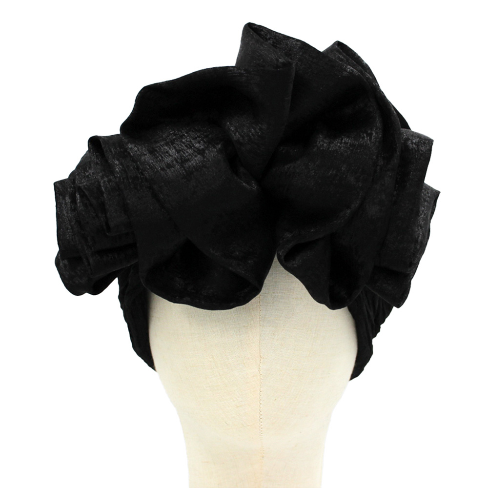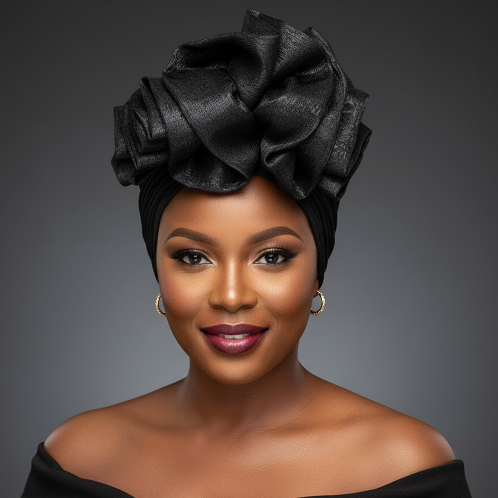 • This elegant ruffled statement headwrap adds dramatic flair and sophistication to any outfit. Designed with voluminous layered detailing, it offers a bold, sculpted silhouette perfect for special occasions, cultural events, or elevating everyday fashion with timeless grace.