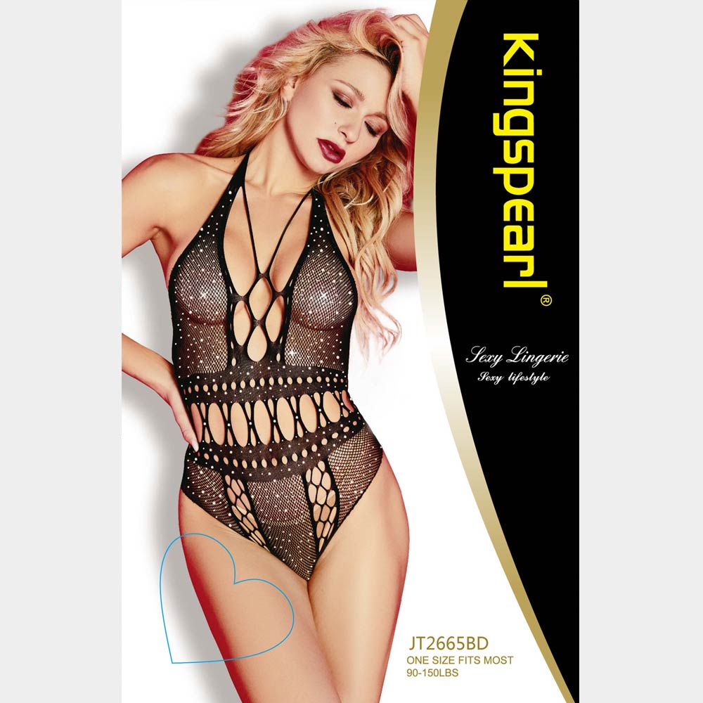 Details • Size : One Size • Material : 90% Nylon, 10% Spandex • Thong NOT Included • Hand Wash Warm • Do Not Bleach • Hang Dry • Striking halter-style bodystocking lingerie with bold cutout detailing, rhinestone embellished and a sculpted, body-hugging silhouette. Designed with a stretchy one-size fit, this statement piece is ideal for intimate wear, novelty gifting, or display, offering confident appeal and eye-catching visual impact.