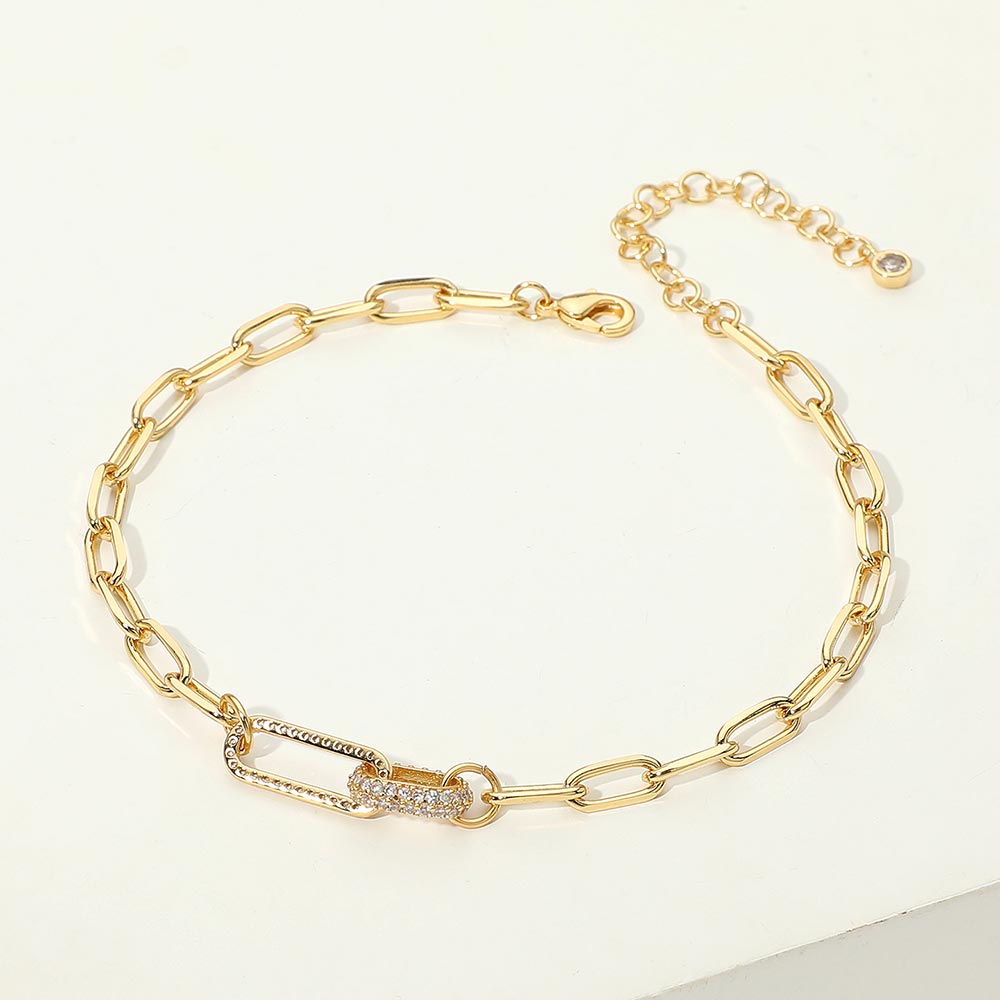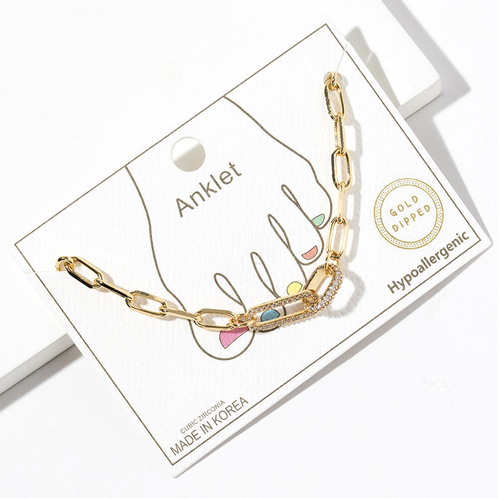 • This stylish anklet features a modern paperclip chain design with a sparkling cubic zirconia-accented charm for added shine. Hypoallergenic and gold-dipped for lasting wear, it brings a chic, minimalist touch to summer outfits. Perfect for everyday elegance or layered looks.