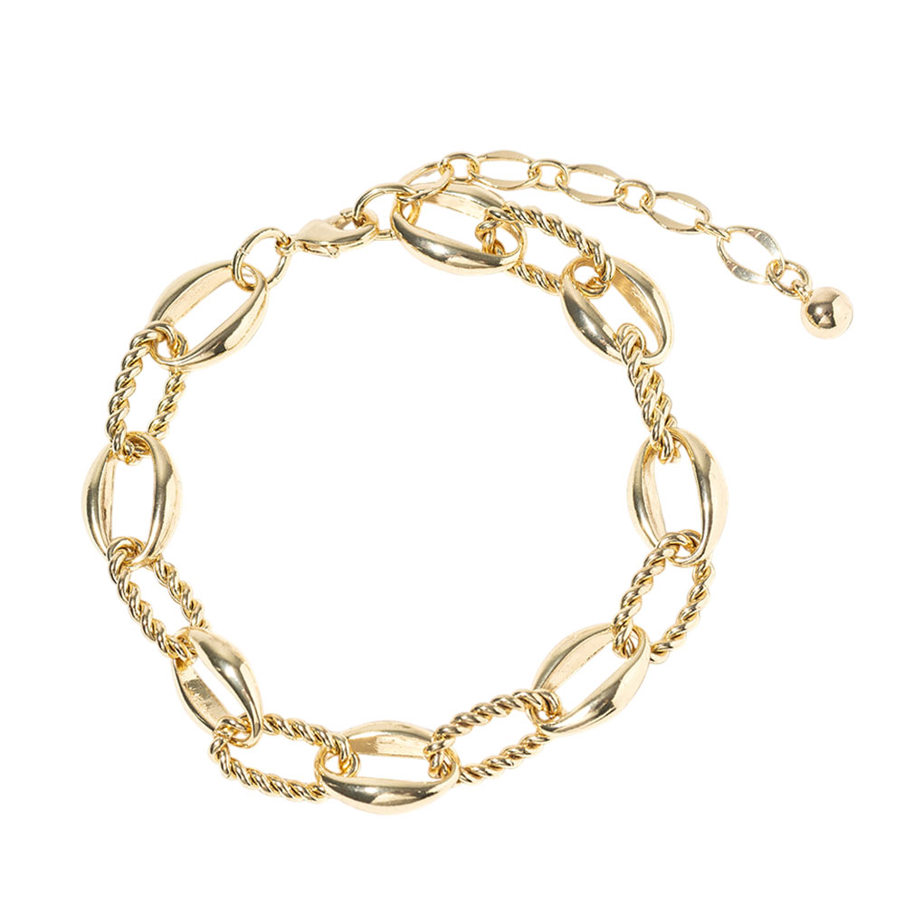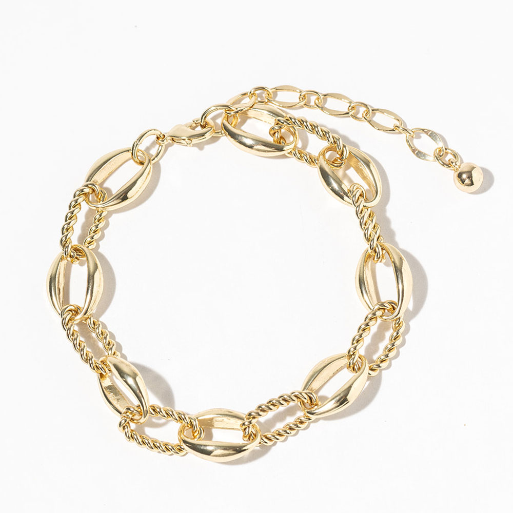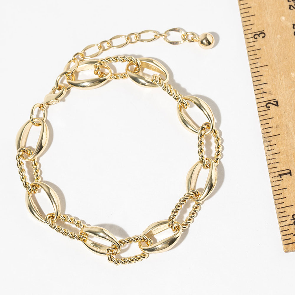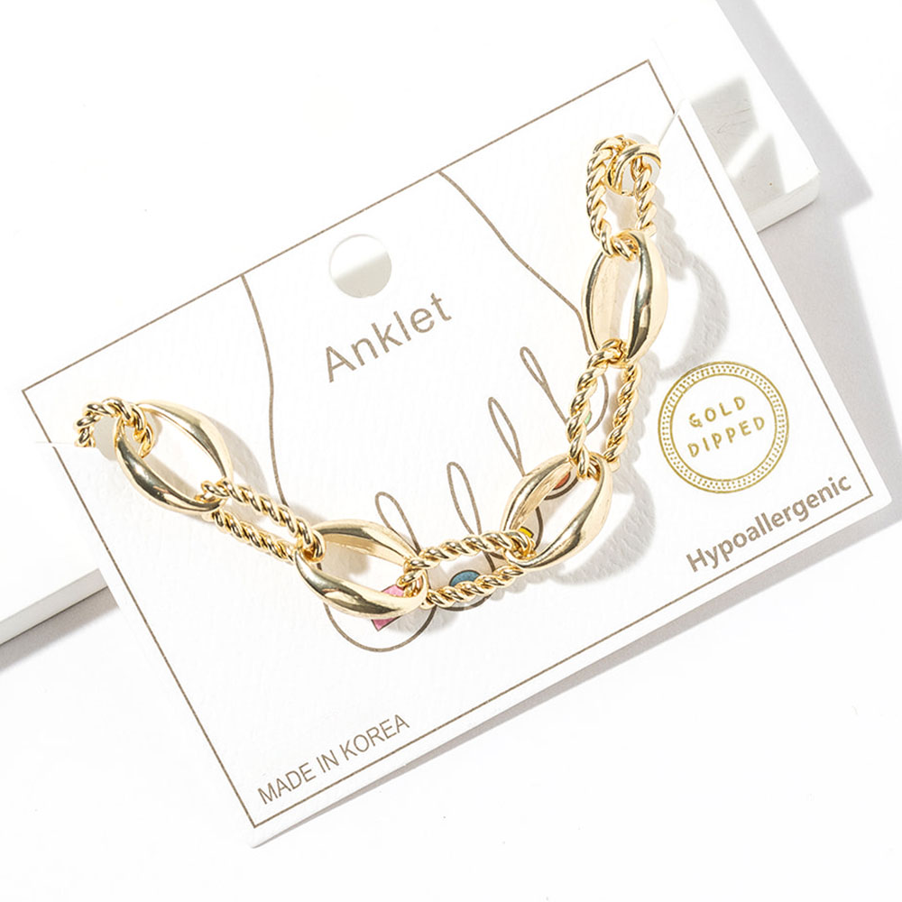 Details • Size : 0.3" H, 8.5" + 2.5" L • Lobster Clasp Closure • Stylish mixed-link anklet designed to elevate everyday and vacation looks. Featuring a bold combination of smooth and twisted links, this ankle bracelet adds eye-catching texture and movement. Ideal for layering or wearing solo, it pairs effortlessly with sandals, flats, or heels for a modern, fashion-forward finish. • Gold Dipped • Made In Korea