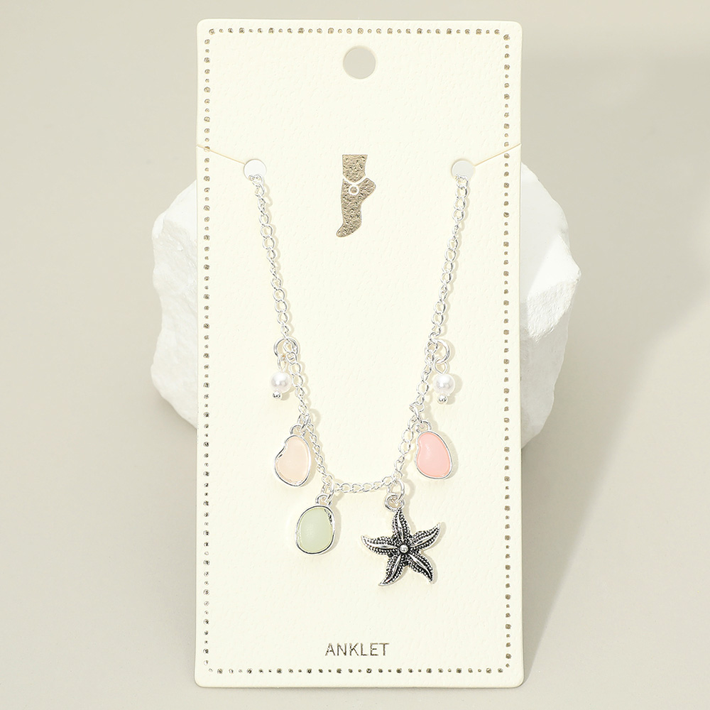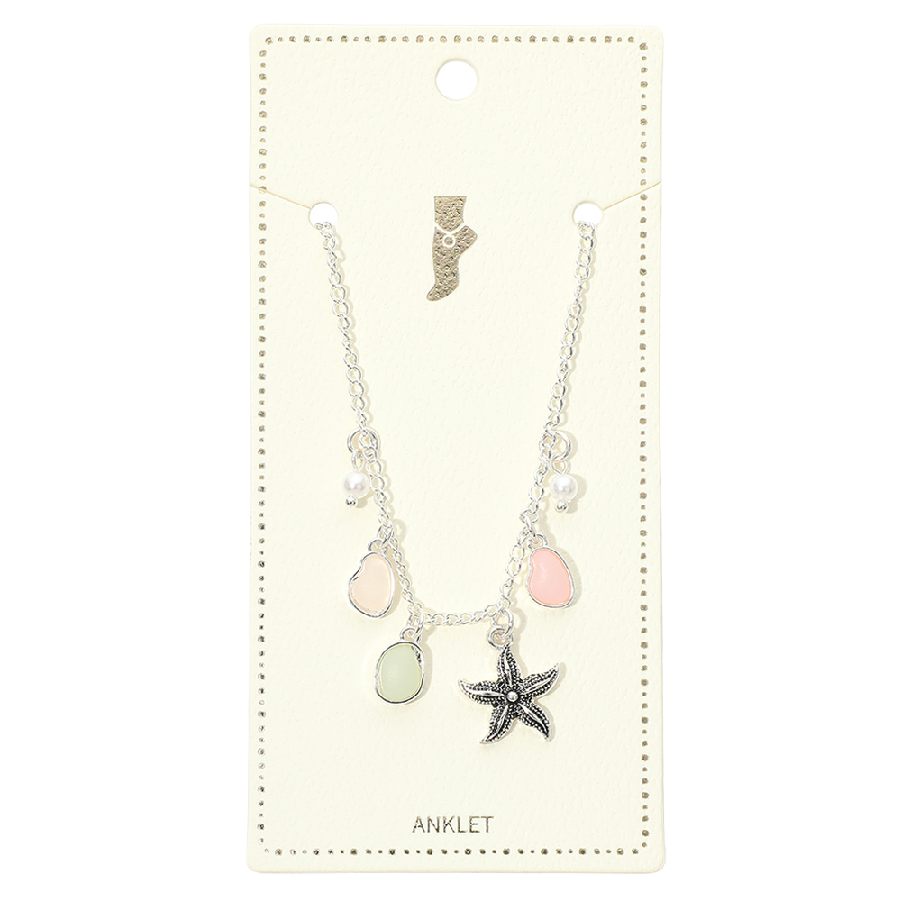 Details • Size : 0.75" H, 9.25" + 1.75" L • Lobster Clasp Closure • Starfish charm anklet featuring delicate dangling accents that create a relaxed, beach-inspired look. Designed to add subtle movement and charm to ankle styling for everyday wear or vacations. Ideal for gifting or boutique collections focused on coastal, ocean, and nature-themed fashion jewelry. • Lead and Nickel Compliant