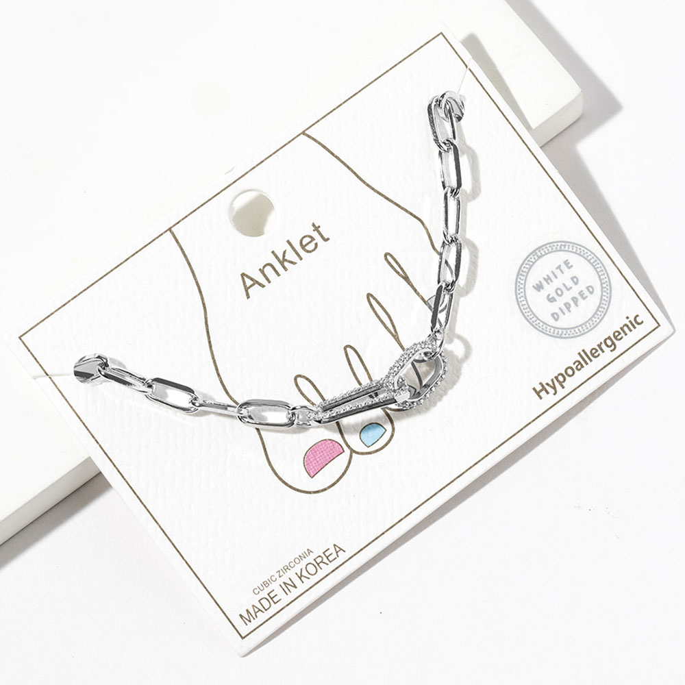 White Gold Dipped CZ Stone Paved Link Accent Paperclip Chain Anklet