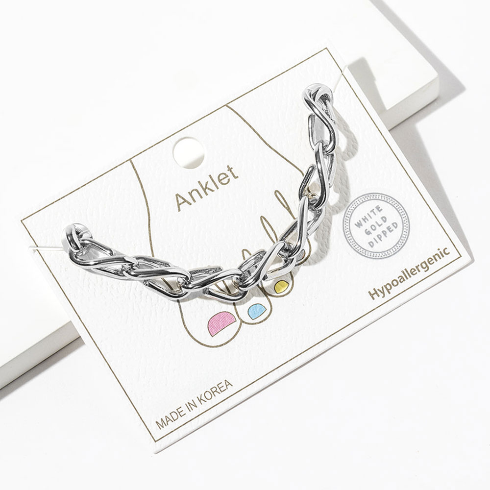 Details • Size : 0.3" H, 8.5" + 2.5" L • Lobster Clasp Closure • Modern twisted link anklet designed for effortless everyday styling. This sleek ankle bracelet features fluid interlocking links that create subtle movement and shine with every step. Perfect for casual wear, vacations, and layering with other ankle jewelry, offering a clean, trend-forward look that complements sandals, sneakers, or heels. • Gold Dipped • Made In Korea