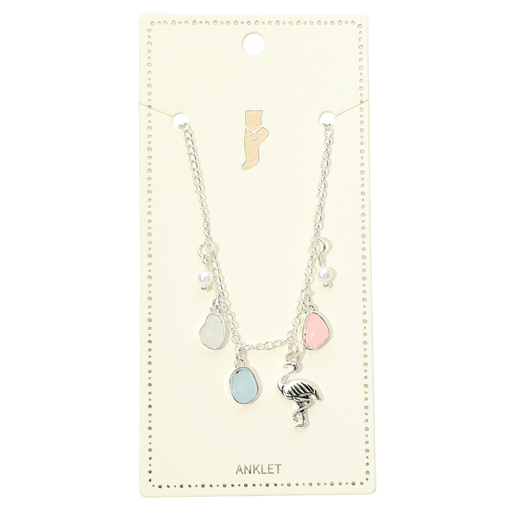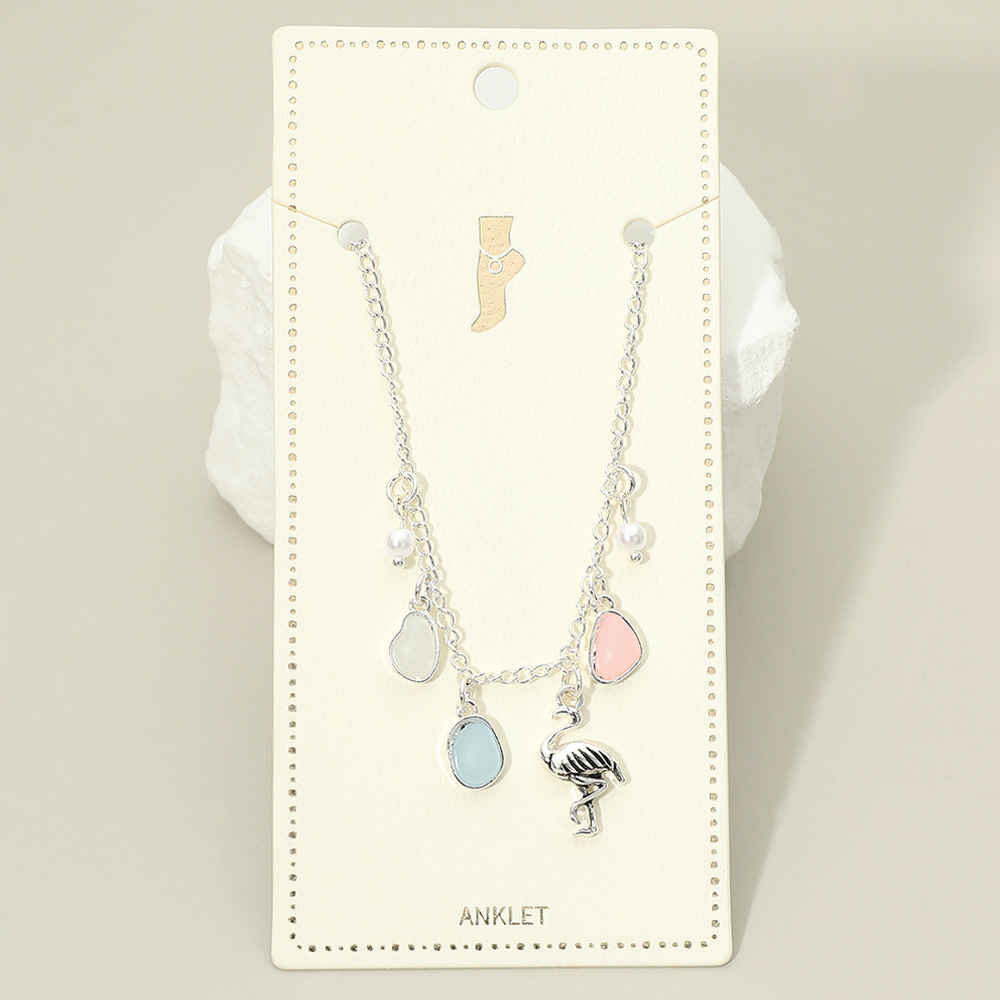 Details • Size : 0.8" H, 9.25" + 1.75" L • Lobster Clasp Closure • Flamingo charm anklet featuring playful tropical-inspired details with delicate dangling accents for subtle movement. Designed to add a fun, vacation-ready touch to ankle styling for everyday wear or getaways. Ideal for gifting or boutique collections focused on beach, resort, and summer-themed fashion jewelry. • Lead and Nickel Compliant