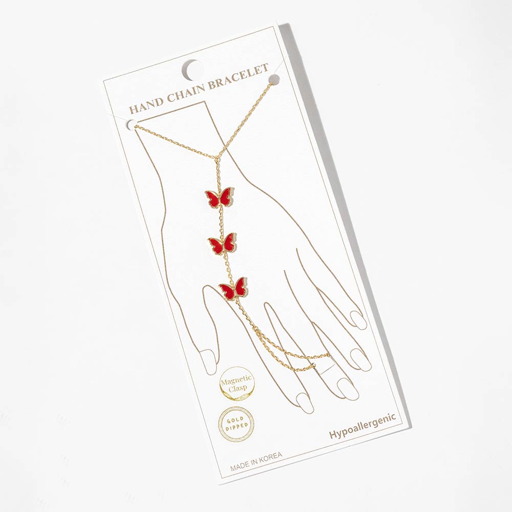 Details • Size : 3" H, 7" + 0.25" L • Ring Size : Free • Magnetic Clasp Closure • This butterfly hand chain bracelet features a delicate wrist-to-finger design accented with butterfly charms for a graceful, eye-catching look. Designed with a magnetic clasp for easy wear, it offers elegant movement and statement appeal. Ideal for boutique jewelry collections, layering styles, and everyday or special occasion accessorizing. • Gold Dipped • Hypoallergenic • Lead and Nickel Compliant • Made In Korea