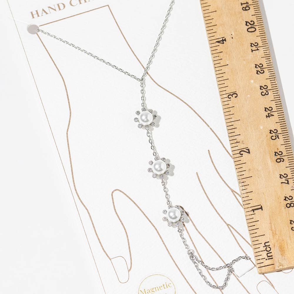 White Gold Dipped CZ Pearl Flower Link Hand Chain Magnetic Bracelet