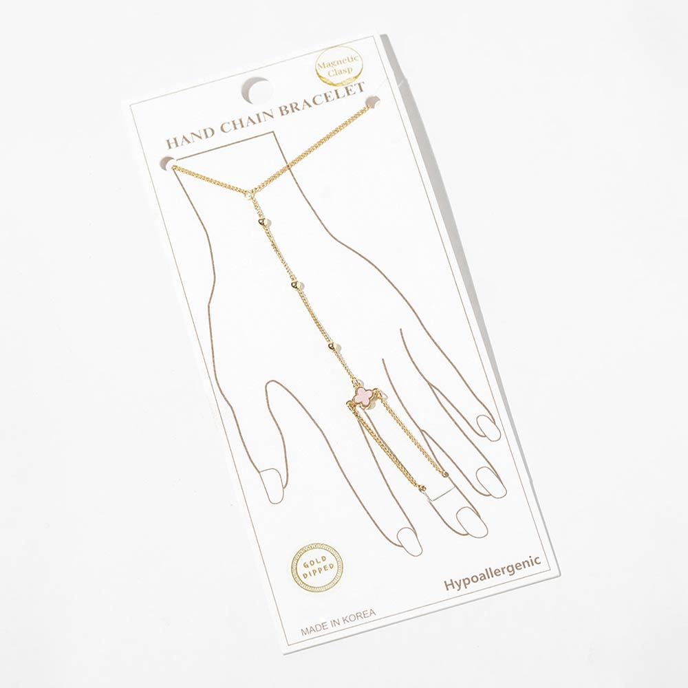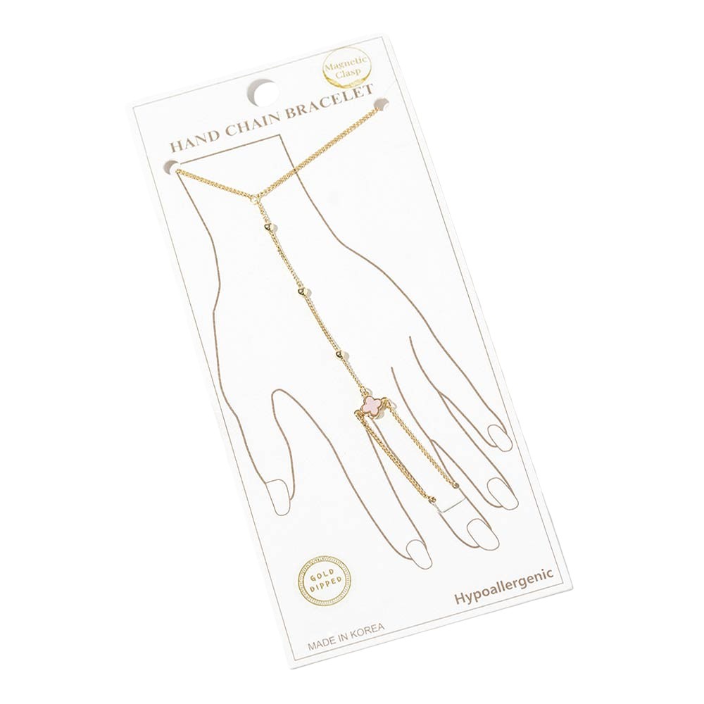Details • Size : 3" H, 7" + 0.25" L • Ring Size : Free • Magnetic Clasp Closure • This stylish hand chain bracelet features a sleek connected design that links wrist and finger for a modern, fashion-forward look. Designed with an easy magnetic clasp for quick wear, it offers a delicate statement ideal for everyday outfits, special occasions, and trend-driven boutique collections. Perfect for customers seeking unique, minimalist hand jewelry with effortless elegance. • Lead and Nickel Compliant • Hypoallergenic • Made In Korea • Gold Dipped