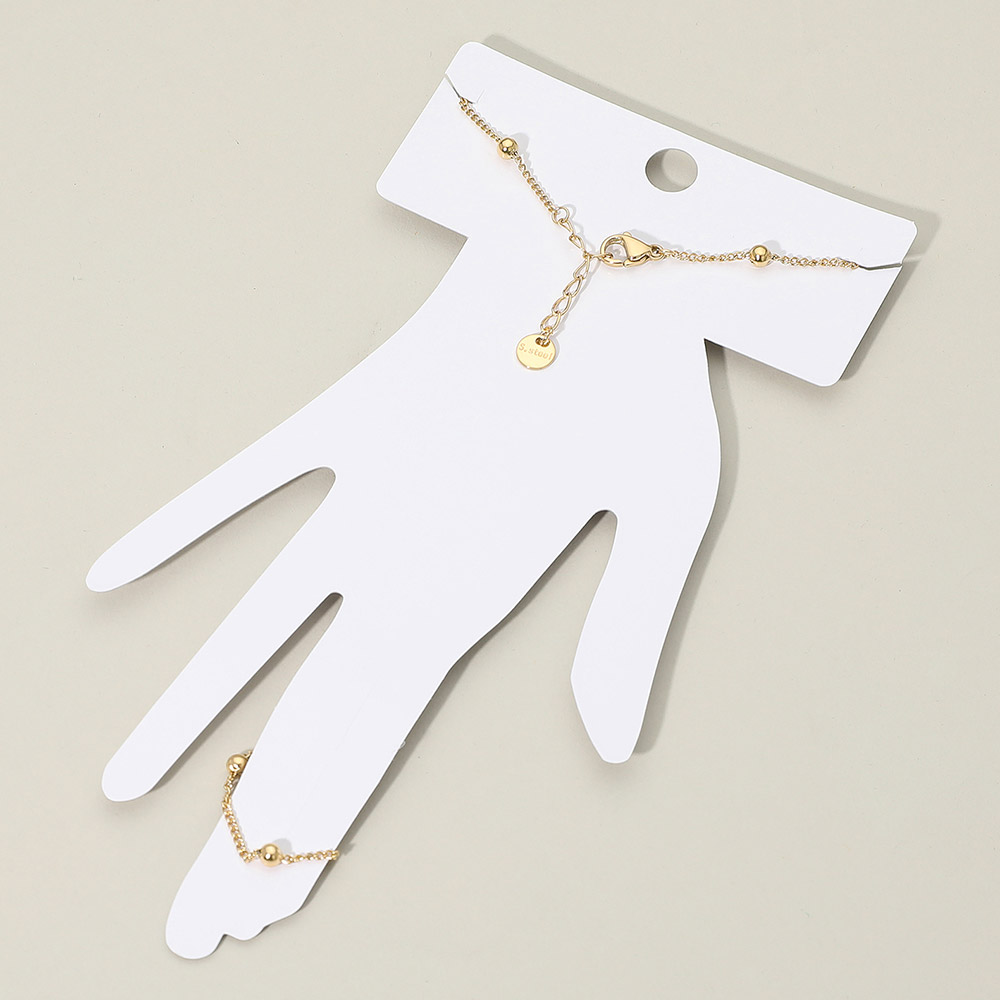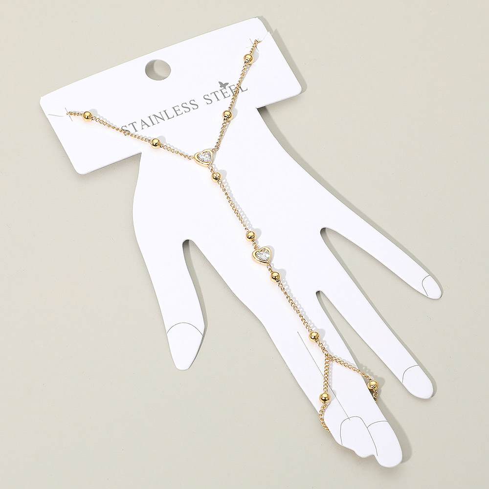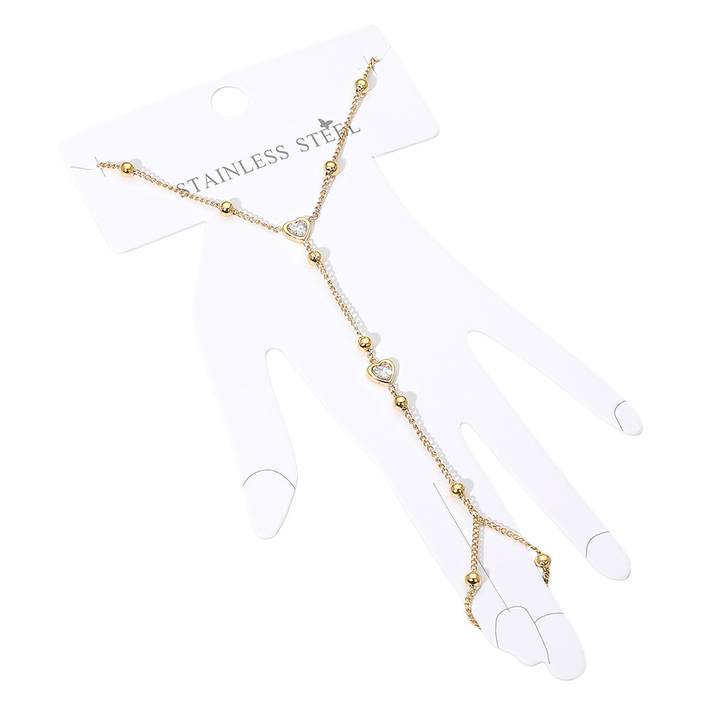 Details • Size : 3.2" H, 6.5" + 1" L • Ring Size : Free • Elegant hand chain bracelet featuring dainty heart charms and beaded accents. Adjustable design offers a comfortable fit, adding a refined touch to everyday or special-occasion looks. A stylish accessory that enhances any outfit with subtle sparkle and charm. • Stainless Steel