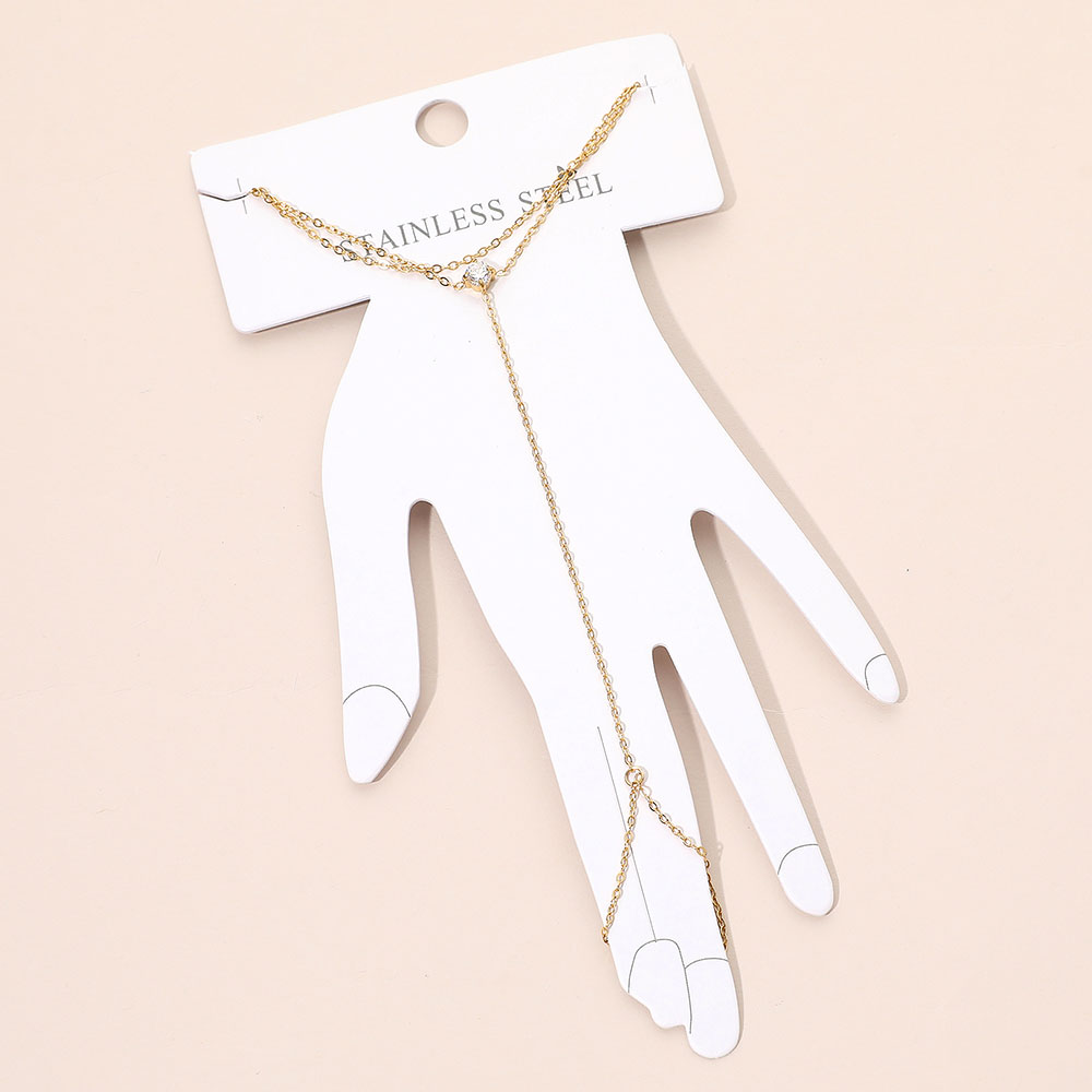 Details • Size : 3.25" H, 6.5" + 1" L • Ring Size : Free • Elegant hand chain bracelet connecting wrist to finger with a delicate, streamlined silhouette and subtle crystal accent for refined shine. Designed for modern layering or standalone wear, this graceful piece elevates everyday style and transitions beautifully into evening looks with effortless sophistication. • Stainless Steel