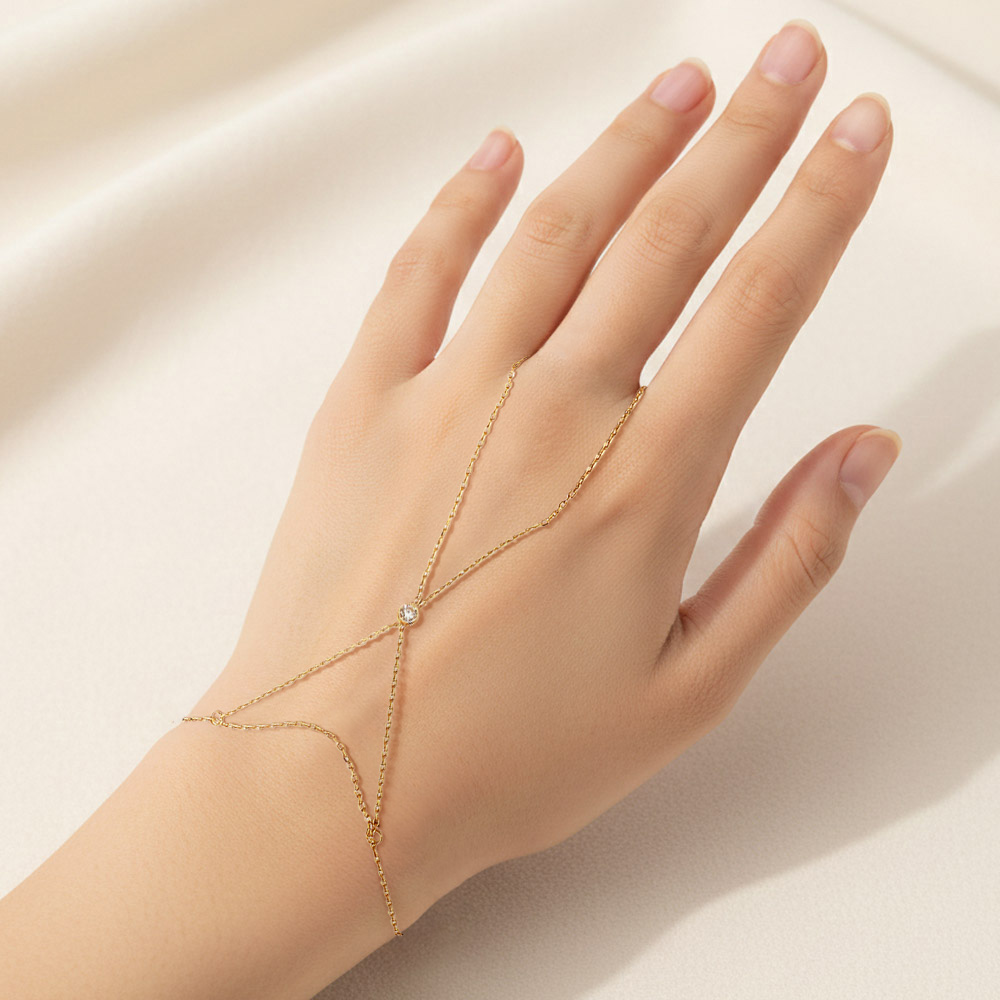 • Delicate double-chain hand bracelet connecting wrist to finger with a refined crystal accent for subtle shimmer and modern elegance. Designed for minimalist layering or standout solo wear, this graceful piece enhances everyday outfits and effortlessly transitions into polished evening styling.