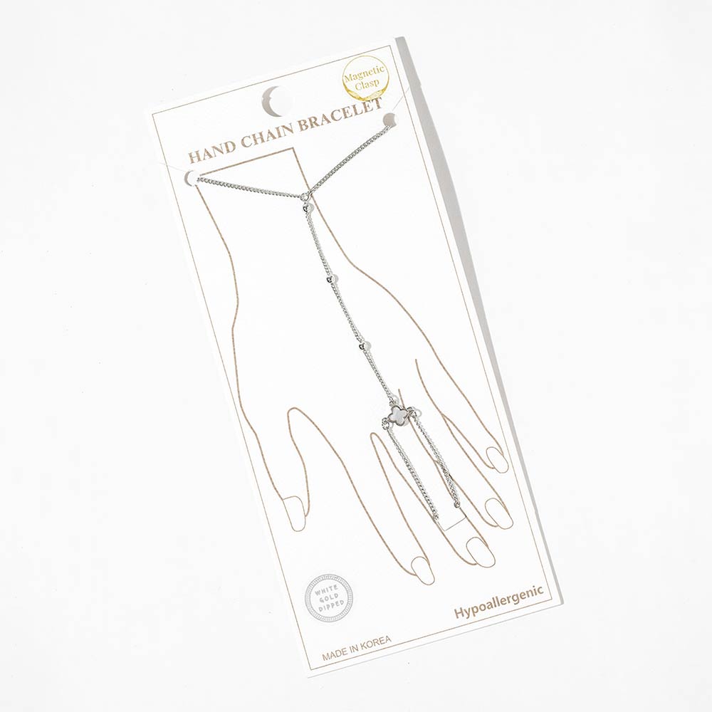 White Gold Dipped Delicate Beaded Mother of Pearl Quatrefoil Accent Hand Chain Magnetic Bracelet