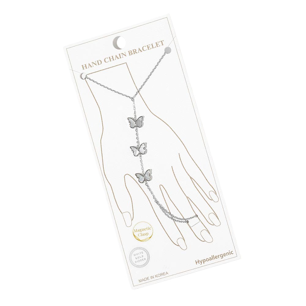 • This butterfly hand chain bracelet features a delicate wrist-to-finger design accented with butterfly charms for a graceful, eye-catching look. Designed with a magnetic clasp for easy wear, it offers elegant movement and statement appeal. Ideal for boutique jewelry collections, layering styles, and everyday or special occasion accessorizing.