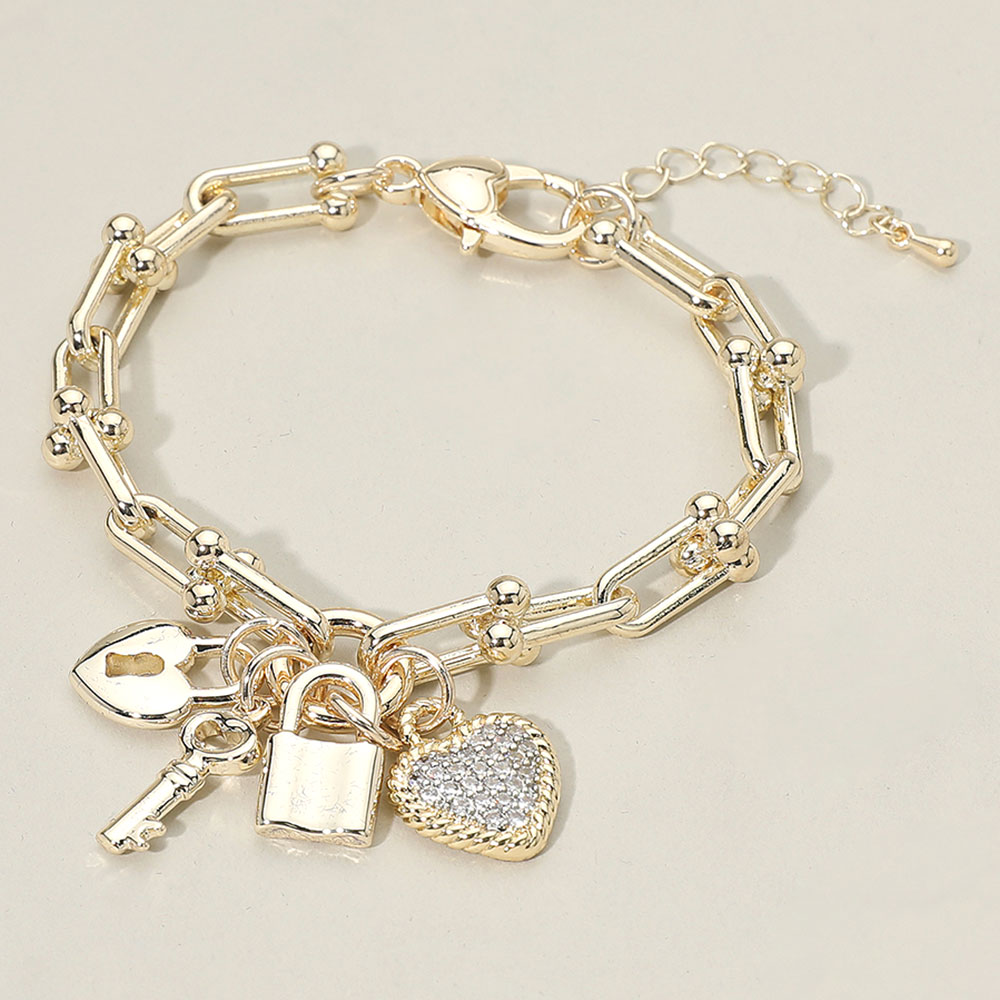 Details • Size : 0.3" H, 8" + 2" L • Charm Size : 1.25" L • Lobster Clasp Closure • Adjustable charm bracelet featuring a stylish link chain adorned with padlock, key, heart and tag charms. Designed for everyday wear, this accessory adds a playful touch to any outfit and makes a great gift. Lightweight, eye-catching and perfect for stacking or wearing solo. • CZ Cubic Zirconia • Gold Dipped