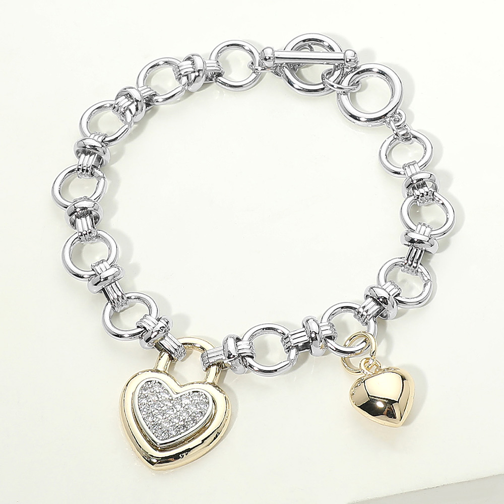 Details • Size : 1" H, 7.5" + 1" L • Toggle Closure • This link bracelet showcases a toggle closure design accented with layered heart charms for a bold yet feminine look. The structured chain silhouette adds visual impact while remaining easy to style for everyday wear or special occasions. A versatile statement accessory ideal for boutiques seeking trend-driven bracelets that attract attention, pair well with layered looks, and enhance curated jewelry collections with modern charm appeal. • Gold Dipped • CZ Cubic Zirconia