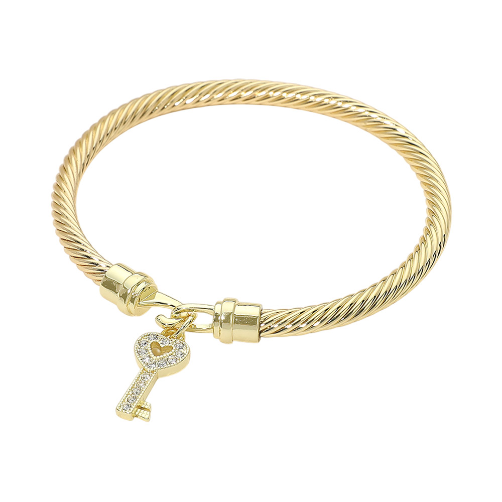 Details • Size : 0.2" H, 2.25" D • Charm Size : 0.5" L • Hook Closure • This key charm cable style bracelet features a sleek, structured design accented with a symbolic dangling key for a meaningful, stylish touch. Designed for everyday wear or special occasions, it offers a secure fit and timeless appeal, making it ideal for gifting, stacking, or boutique jewelry collections that focus on modern elegance. • CZ Cubic Zirconia