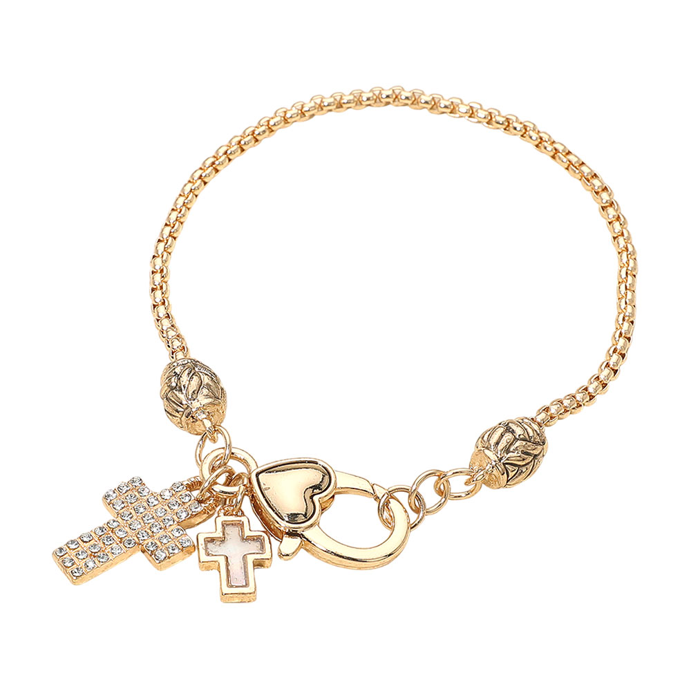 • Add a touch of elegance with this stylish bracelet featuring sparkling cross charms and a heart accent. Perfect for layering or wearing alone, this versatile accessory makes a meaningful gift or a chic addition to any jewelry collection.