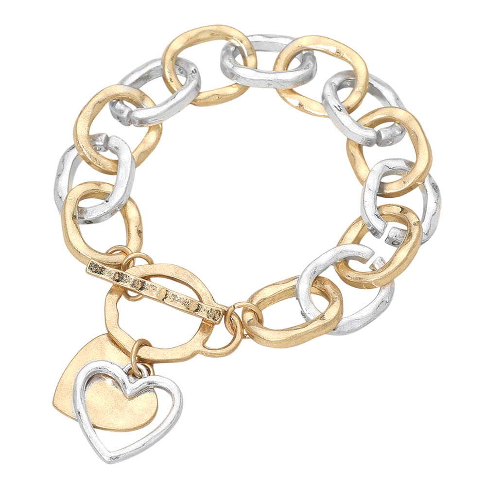 Details • Size : 0.6" H, 8" + 1" L • Charm Size : 1" L • Toggle Closure • Bold chain bracelet featuring oversized rounded links with a secure toggle closure, accented by layered heart charms for a modern yet sentimental look. Designed for statement styling, this bracelet adds dimension and character to everyday outfits, making it ideal for stacking or wearing alone as a standout accessory. • Lead and Nickel Compliant