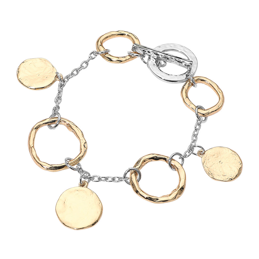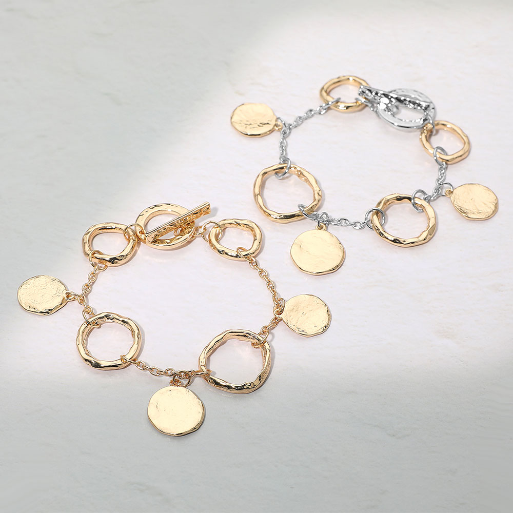 • Statement charm bracelet featuring linked circular elements and softly textured drop accents for a modern, eye-catching look. Designed to move with every gesture, it layers easily with other accessories or shines as a bold solo piece.