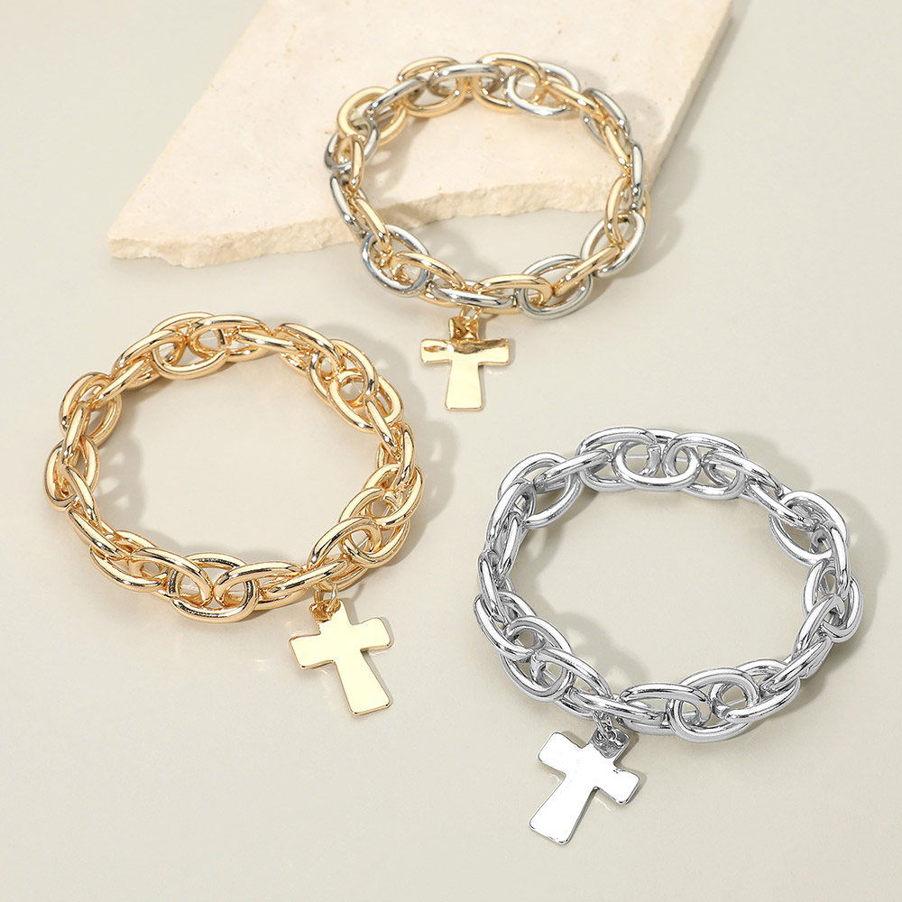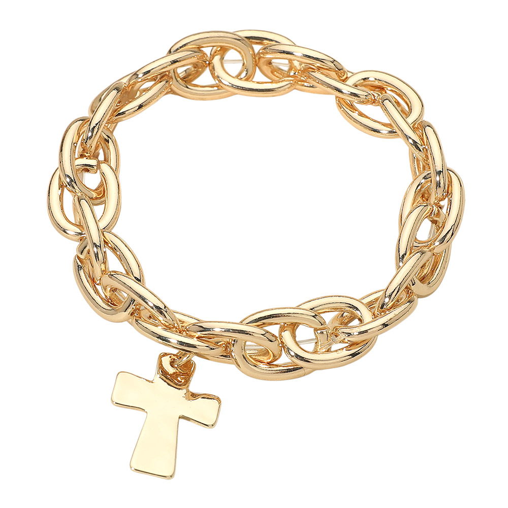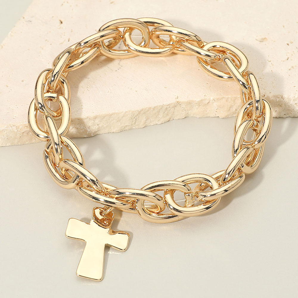 Metal Cross Charm Chunky Chain Link Stretch Bracelet