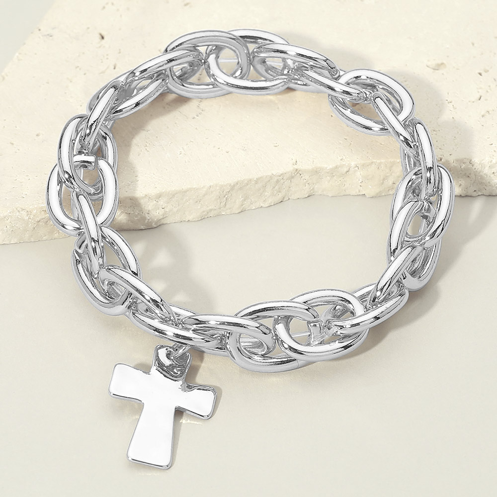 Metal Cross Charm Chunky Chain Link Stretch Bracelet
