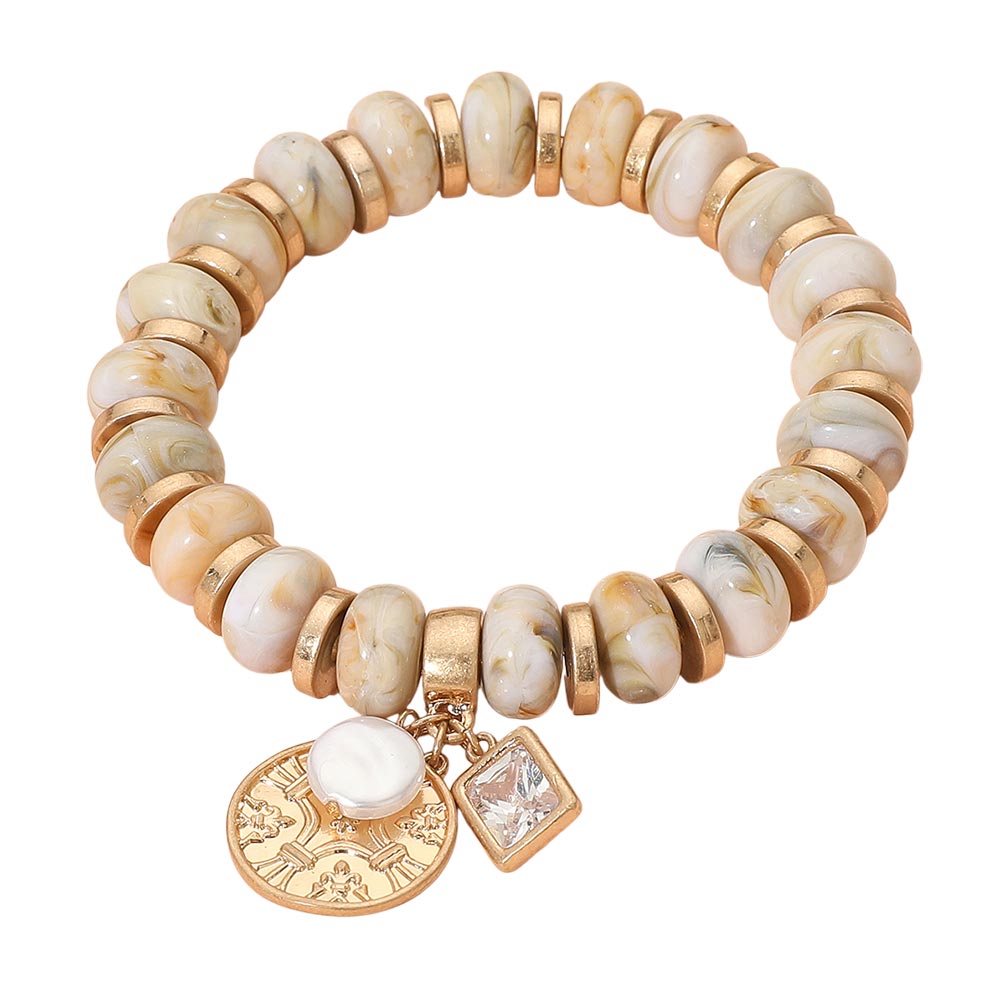 Metal Embossed Medal Square Stone Pearl Charm Rein Disc Beaded Stretch Bracelet