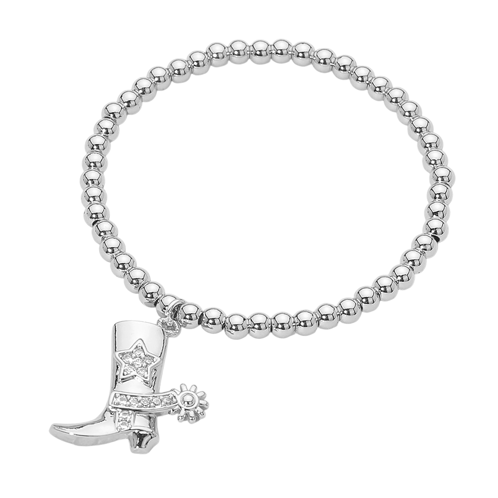 Details • Size : 0.1" H • Charm Size : 0.8" X 0.7" • Stretchable • This western boot charm beaded stretch bracelet features a playful boot-shaped accent paired with polished round beads for a fun yet stylish statement. The flexible stretch design allows easy wear and a comfortable fit, making it ideal for everyday styling or themed outfits. The western-inspired charm adds personality and trend appeal, perfect for boutiques, gifting, festivals, and seasonal collections. A unique accessory that blends charm, movement, and effortless wearability. • CZ Cubic Zirconia • Stainless Steel
