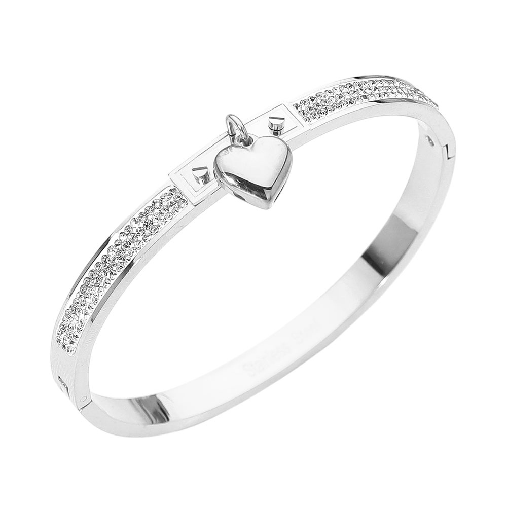 Details • Size : 0.25" H, 2.3" D • Charm Size : 0.6" L • Hinged Closure • Sleek bangle featuring a dangling heart charm with subtle sparkle accents for a romantic, modern look. Comfortable for daily wear and easy to layer or style solo, making it a versatile accessory for gifting, date nights, or elevating everyday outfits. • CZ Cubic Zirconia • Stainless Steel