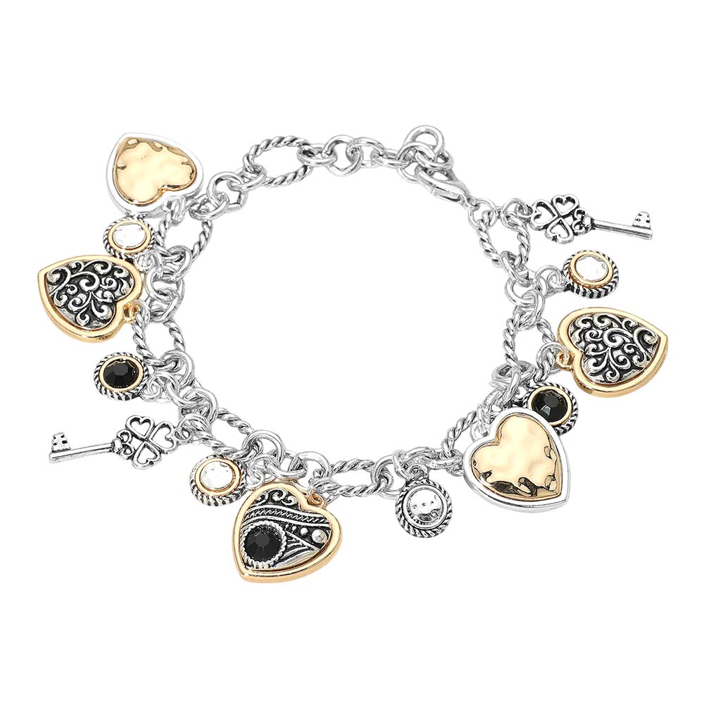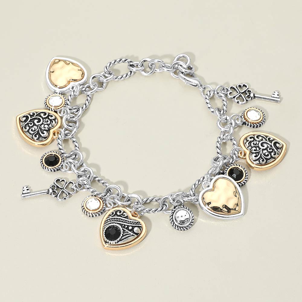 Two Tone Antique Metal Heart Clover Key Stone Charm Station Bracelet