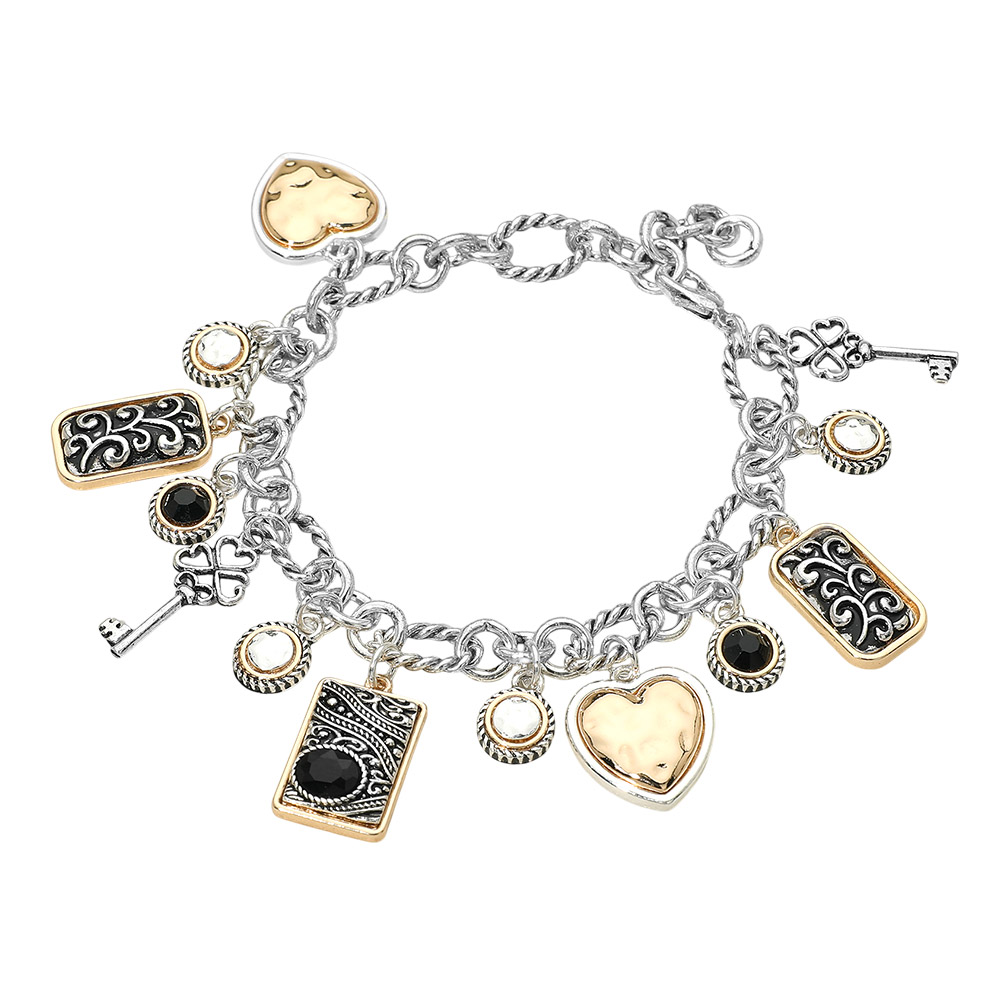 Two Tone Antique Metal Heart Key Stone Rectangular Scrollwork Charm Station Bracelet