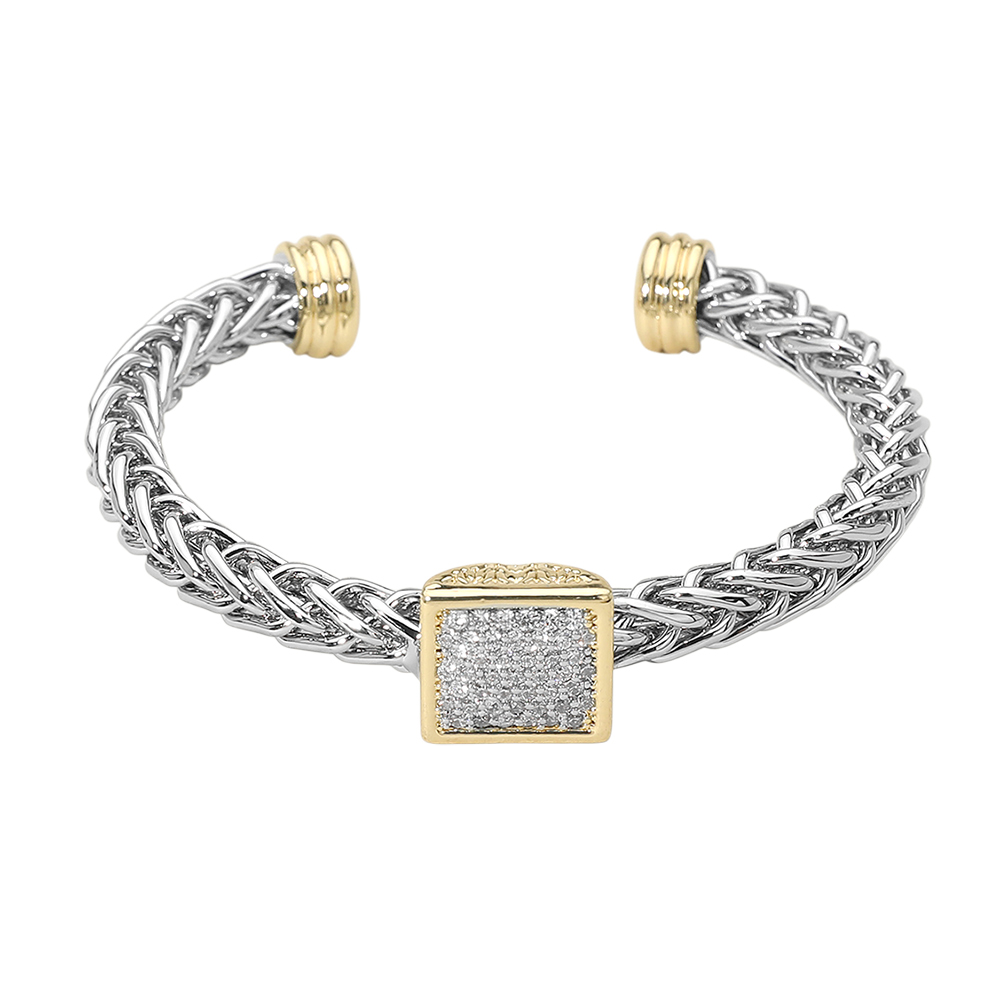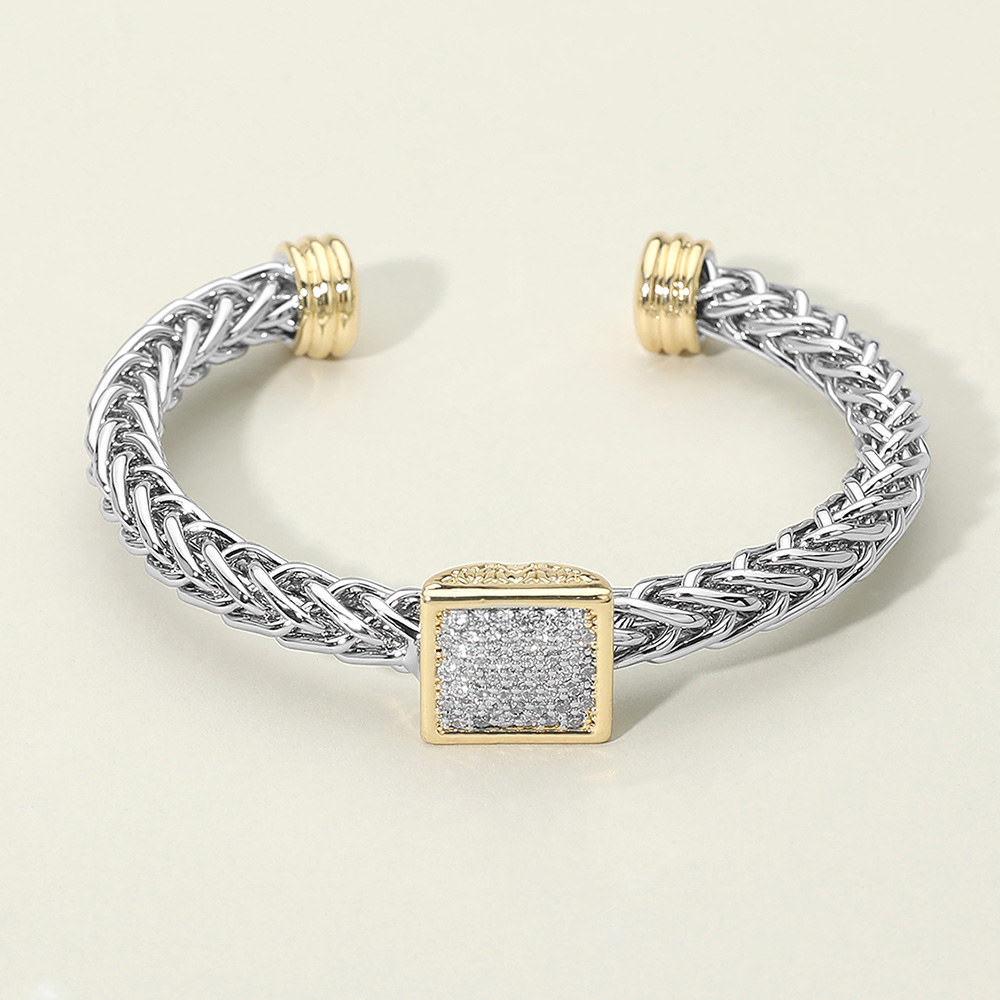 Details • Size : 0.6" H, 2.3" D • Cuff • Modern chain-style cuff bracelet featuring a bold square crystal accent for a refined statement look. Designed to balance structure and shine, this versatile piece elevates everyday outfits and adds contemporary appeal to trend-focused jewelry collections. • CZ Cubic Zirconia • Gold Dipped