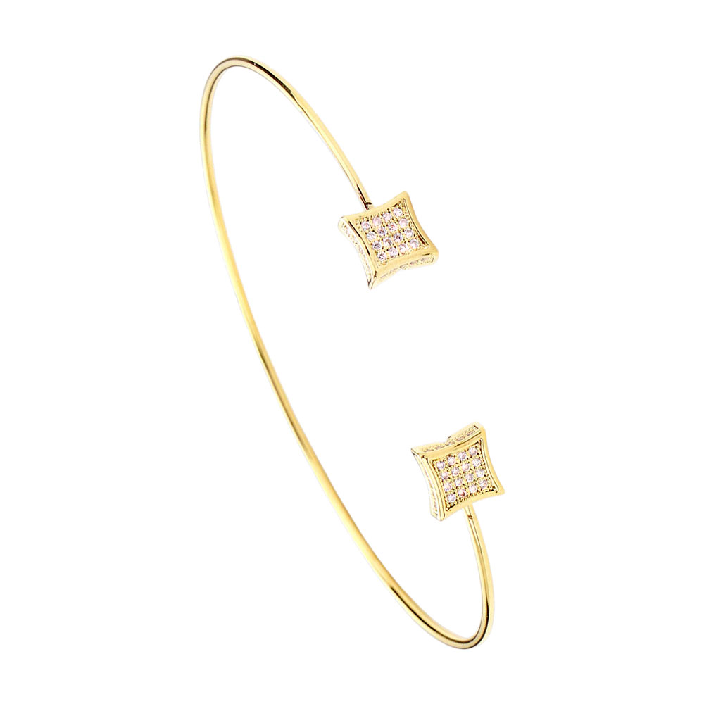 Details • Size : 0.25" H • Cuff • Elegant open cuff bracelet featuring slim band design with geometric crystal-accented ends. A refined piece that adds subtle sparkle and sophistication, perfect for layering or wearing solo. • Lead and Nickel Compliant • Brass • CZ Cubic Zirconia