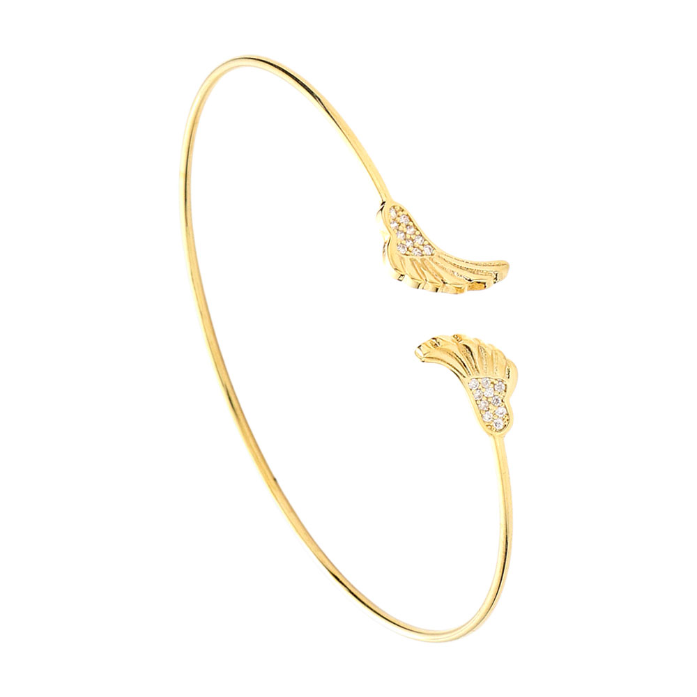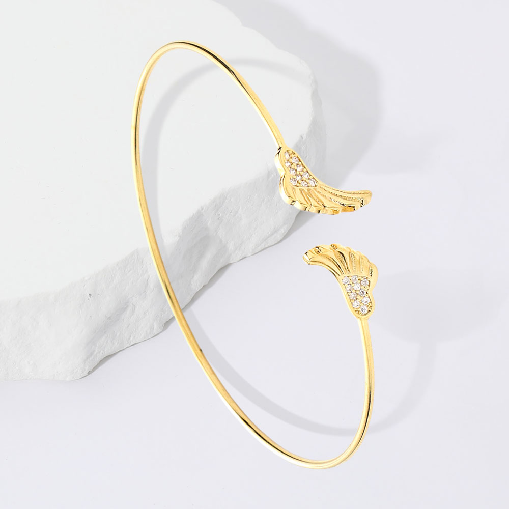 Details • Size : 0.5" H • Cuff • Elegant wing cuff bracelet with an open bangle design, featuring dual wing accents that symbolize freedom and grace. Lightweight and versatile, perfect for stacking or wearing solo for a chic and stylish look. • Lead and Nickel Compliant • Brass • CZ Cubic Zirconia
