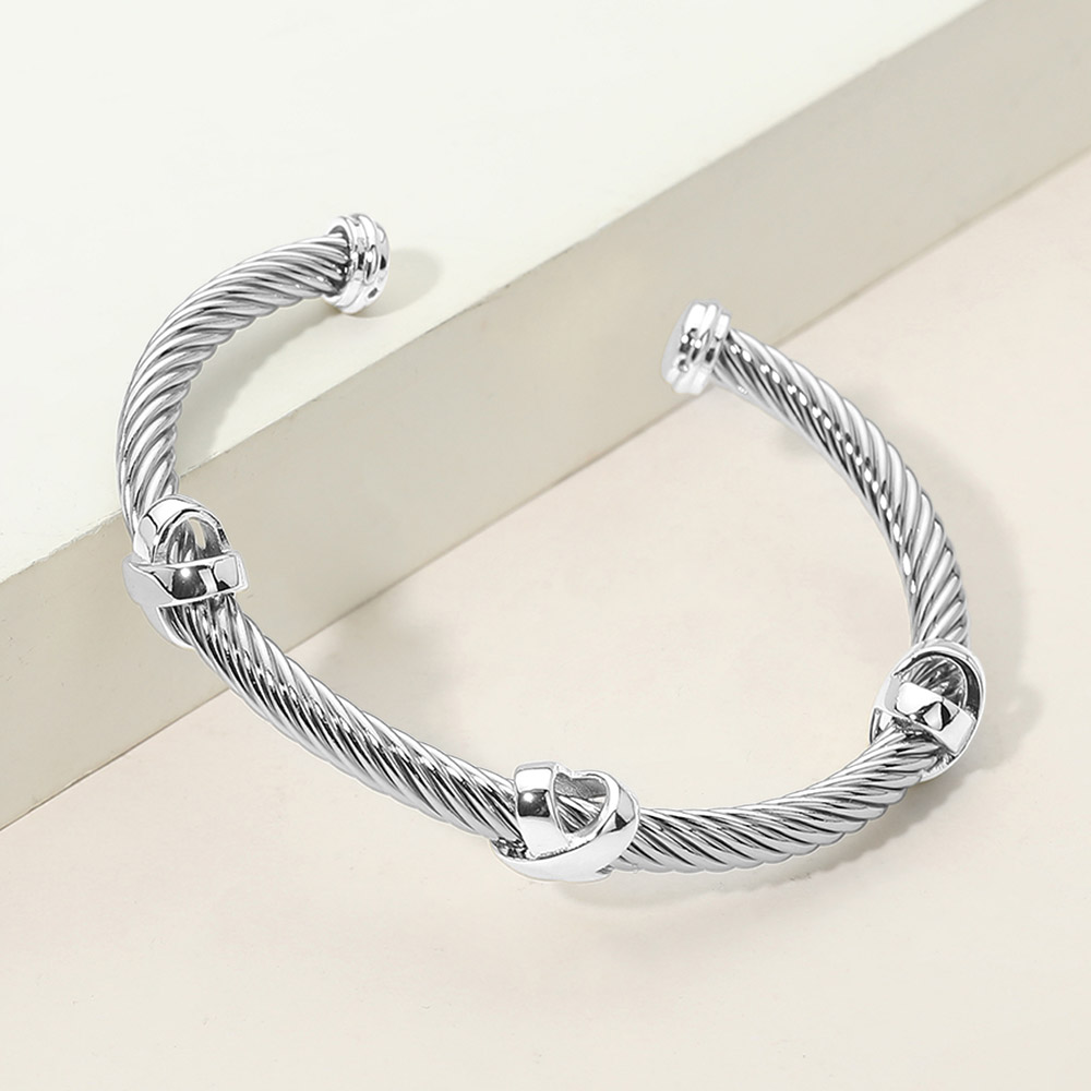 • Elegant open cuff bracelet featuring a twisted cable design with a sculpted heart accent at the center. Designed for easy wear and everyday styling, this timeless cuff adds a refined touch to casual and elevated looks, making it a versatile choice for boutiques, gifting, and layered jewelry collections.