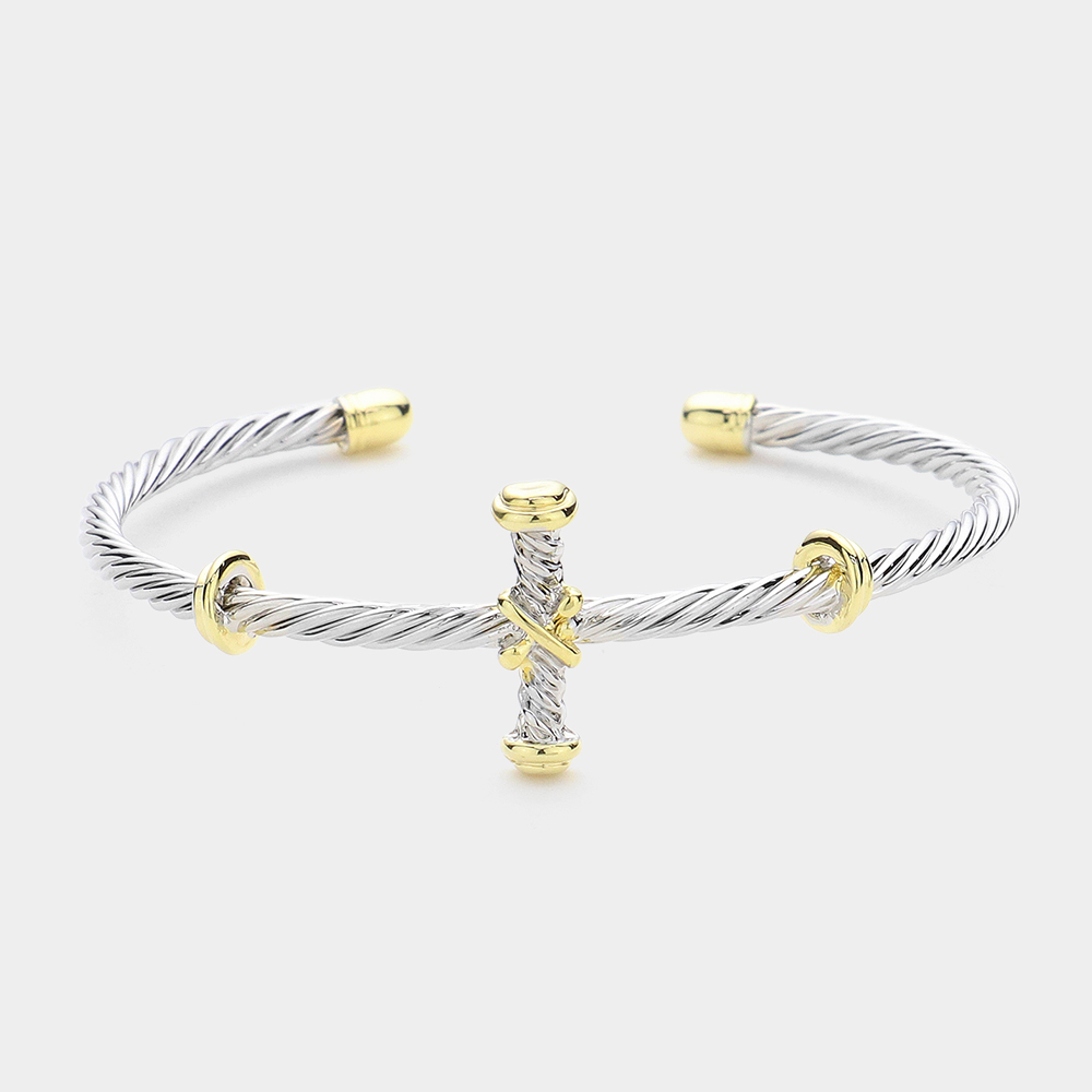 Cross Pointed Two Tone Textured Cable Metal Cuff Bracelet