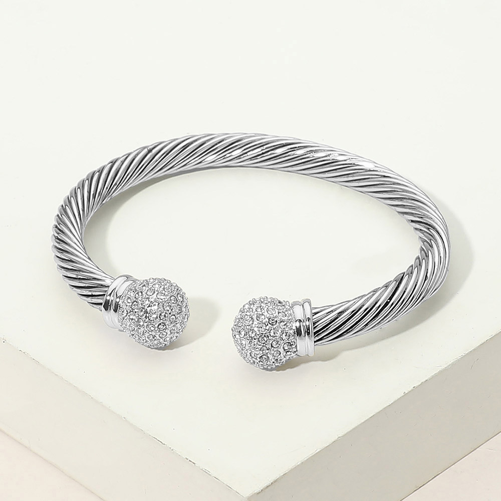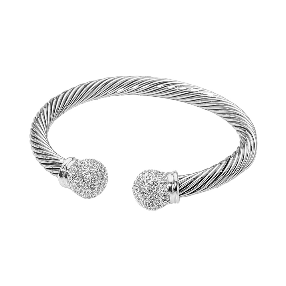 • Elegant open cuff bracelet featuring a sculpted twisted cable design finished with sparkling crystal ball end accents. Slip-on style offers comfort and flexibility while delivering a refined statement look. Perfect for stacking, gifting, or elevating everyday outfits in boutique and fashion-forward jewelry collections.