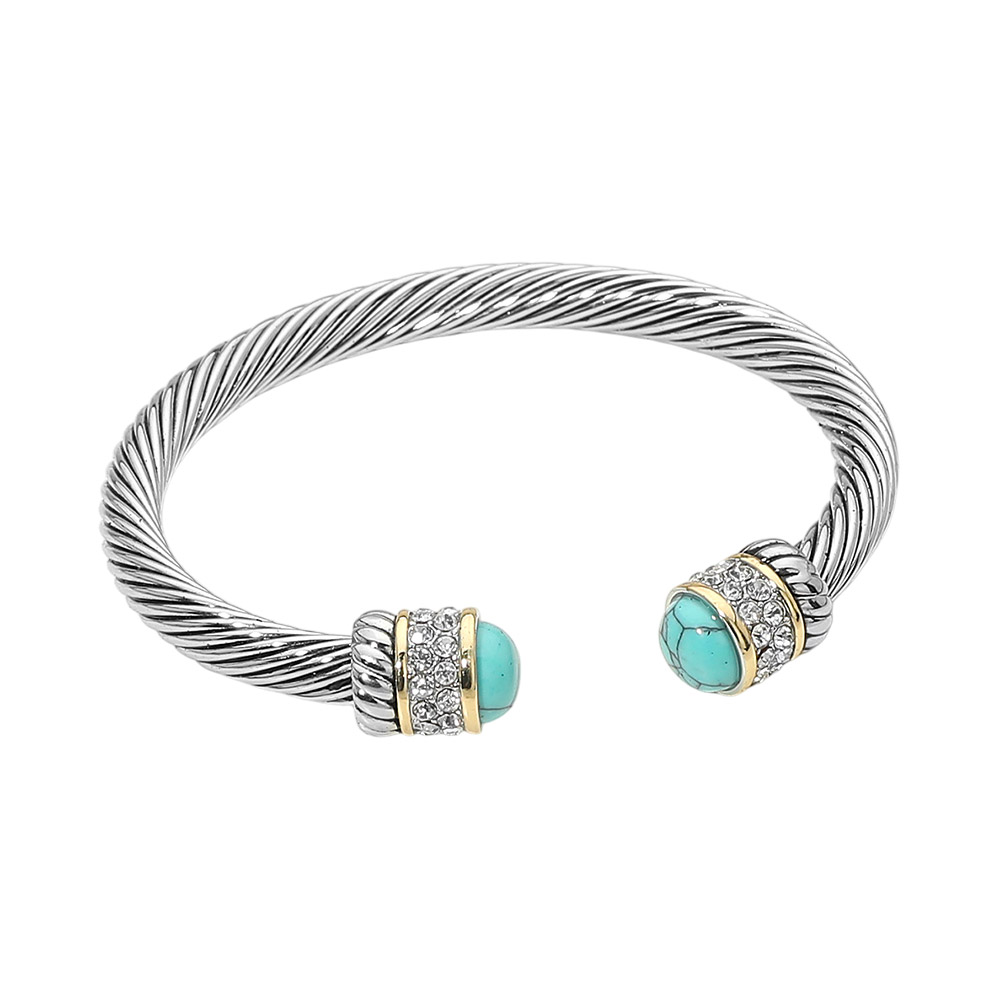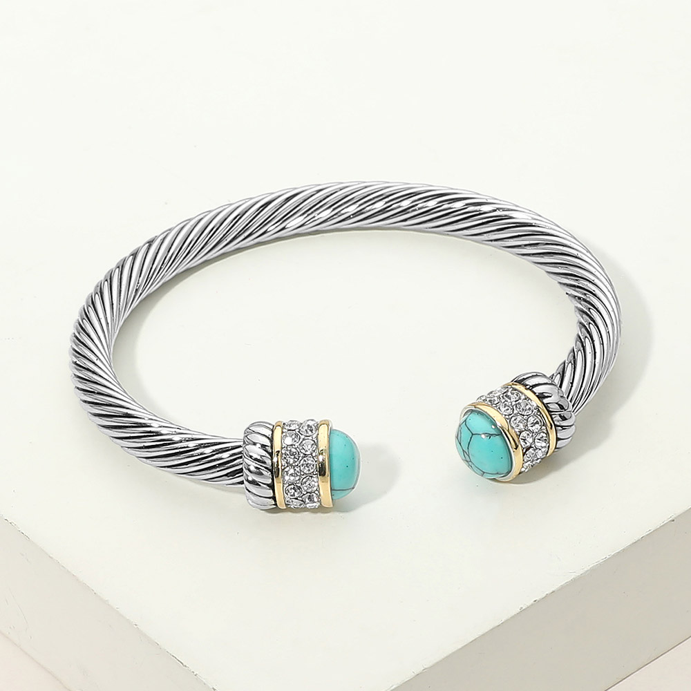 • Sleek open cuff bracelet featuring a twisted cable silhouette with polished end accents and crystal detailing. Designed for easy slip-on wear, this structured cuff adds a refined, modern touch to everyday outfits and elevated looks, making it a versatile option for gifting, boutiques, and layered jewelry styling.