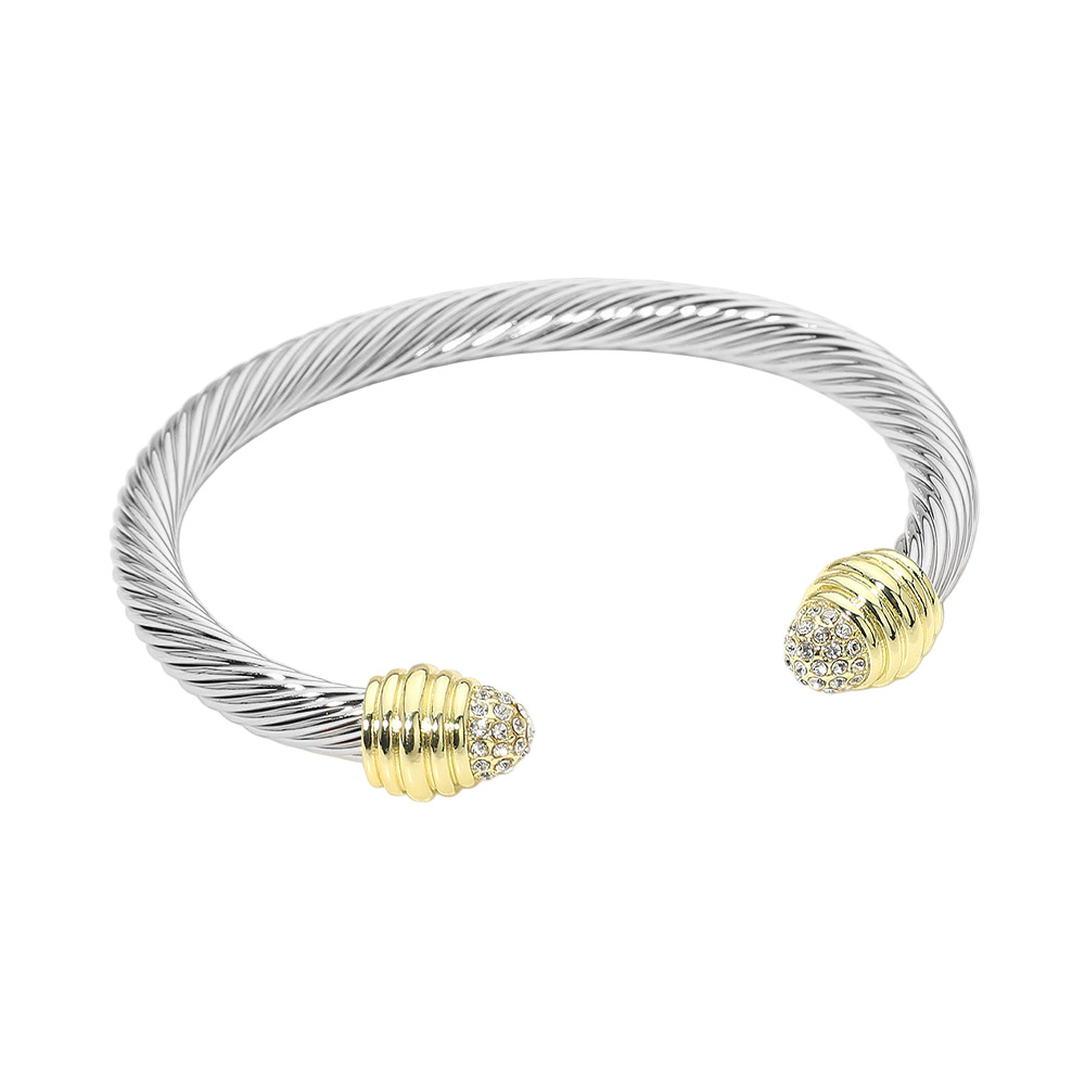• Sleek open cuff bracelet featuring a twisted cable silhouette finished with sparkling crystal accent end caps. Designed for comfortable slip-on wear, this statement bracelet adds refined shine and modern elegance to everyday outfits, special occasions, and layered wrist styling. Perfect for gifting or boutique collections.