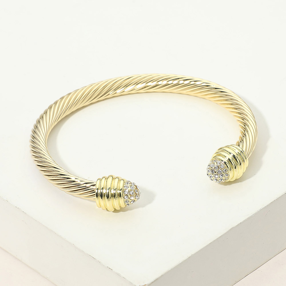 • Sleek open cuff bracelet featuring a twisted cable silhouette finished with sparkling crystal accent end caps. Designed for comfortable slip-on wear, this statement bracelet adds refined shine and modern elegance to everyday outfits, special occasions, and layered wrist styling. Perfect for gifting or boutique collections.
