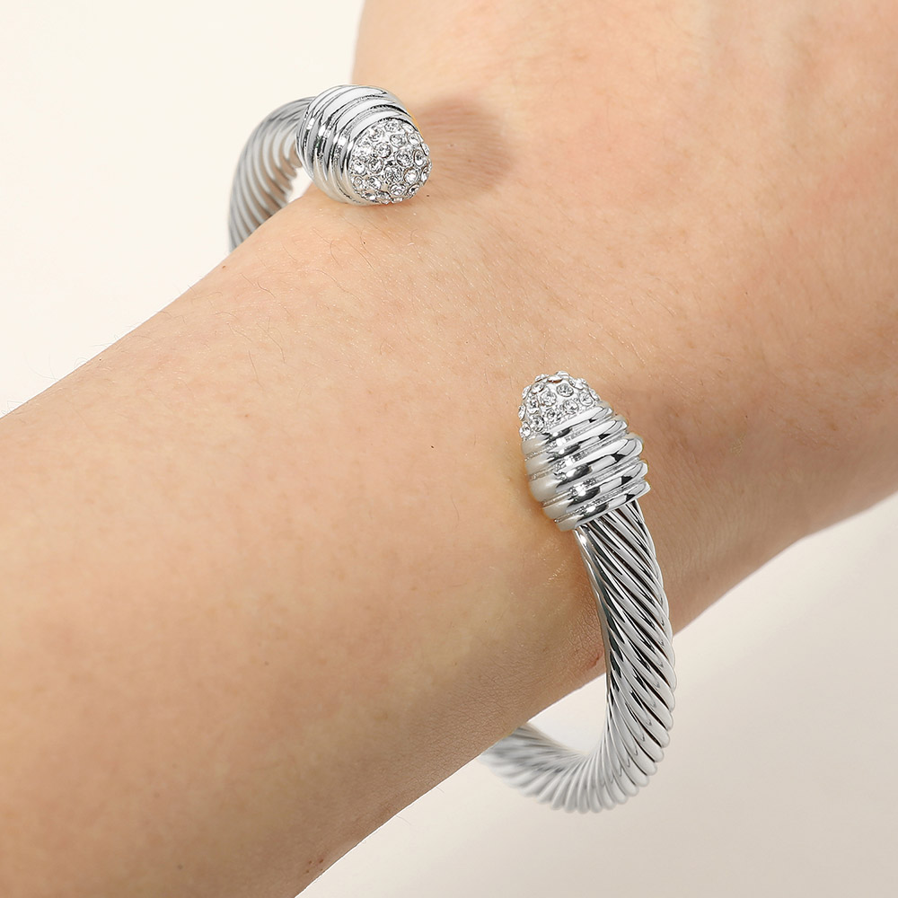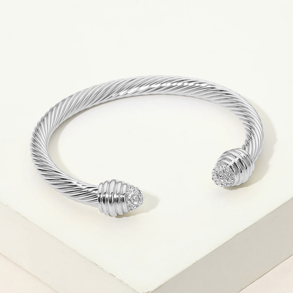 • Sleek open cuff bracelet featuring a twisted cable silhouette finished with sparkling crystal accent end caps. Designed for comfortable slip-on wear, this statement bracelet adds refined shine and modern elegance to everyday outfits, special occasions, and layered wrist styling. Perfect for gifting or boutique collections.