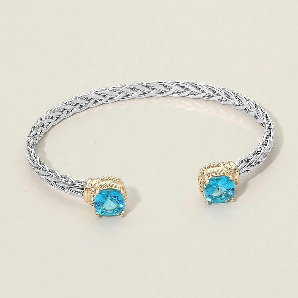 • Refined open cuff bracelet featuring a braided band and square crystal end details. Designed with a structured silhouette and elegant sparkle, this versatile accessory pairs effortlessly with casual or dress looks and layers beautifully with other bracelets for curated styling.