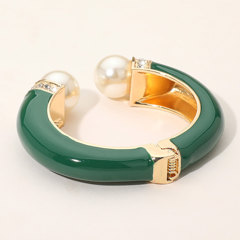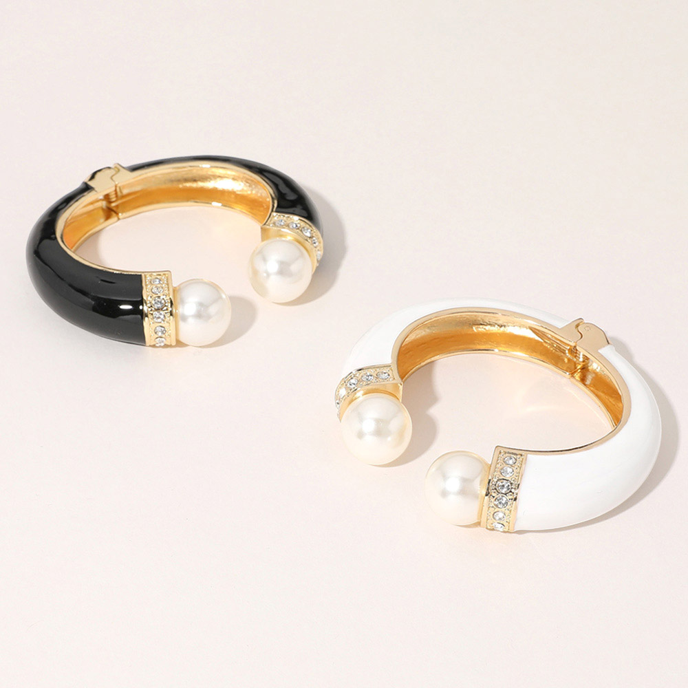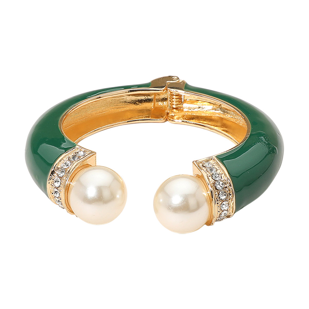 Details • Size : 0.75" H, 2.4" D • Cuff / Hinged Closure • Stylish open cuff bracelet featuring dual rounded ends accented with sparkling crystals. The smooth enamel surface and elegant shape make it a standout accessory for any outfit. Perfect blend of modern chic and timeless elegance for casual or dressy occasions. • Lead and Nickel Compliant • Gold Dipped